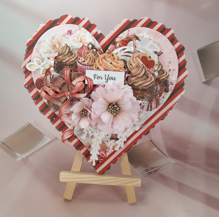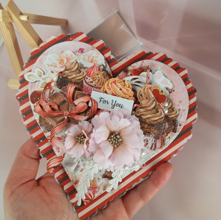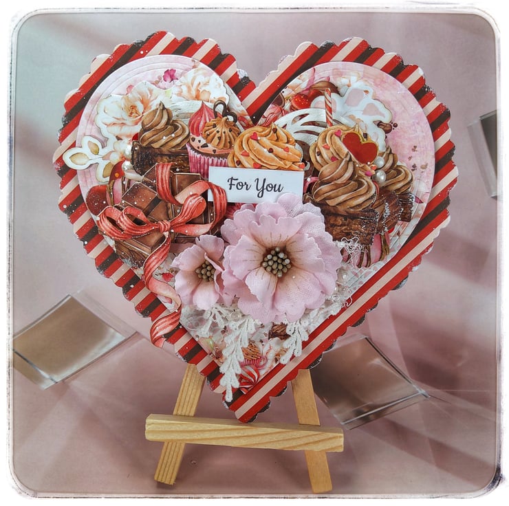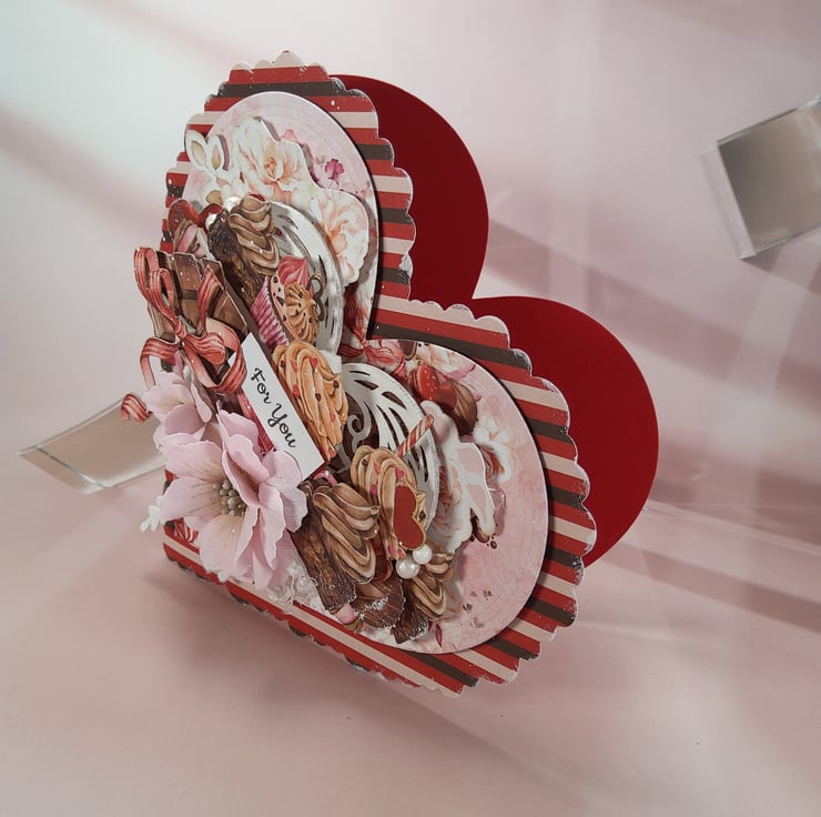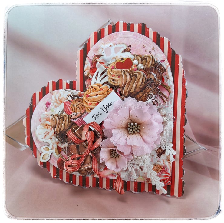 A beautifully detailed handmade heart-shaped greeting card featuring a “For You” sentiment and a rich layered composition inspired by sweet treats and romantic details. Perfect for expressing love, appreciation and warm feelings on special occasions.