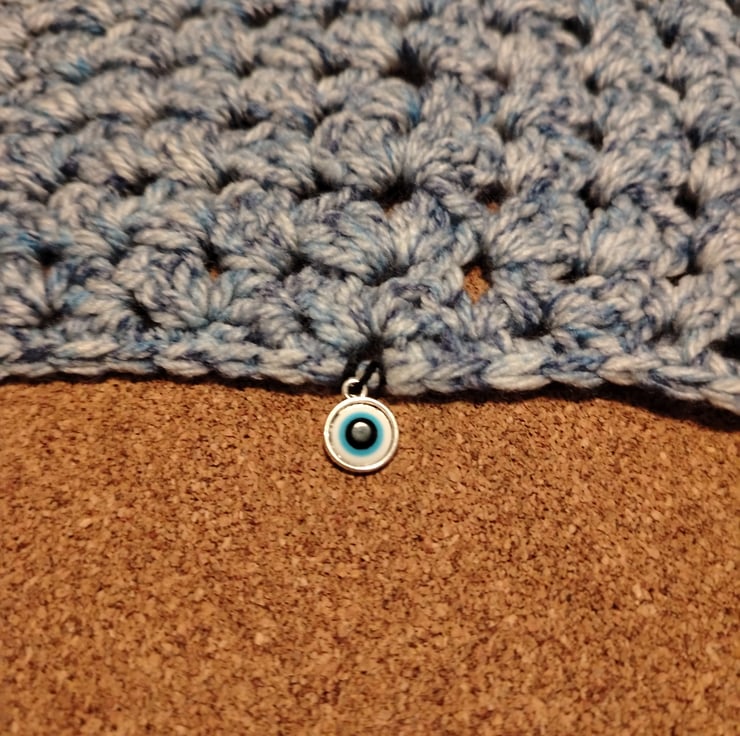 Crocheted kerchief with an evil eye protective charm set on the forehead. Fashionable and functional for everyday wear.