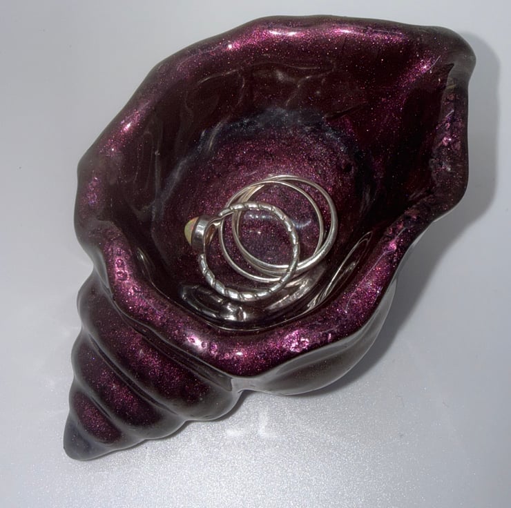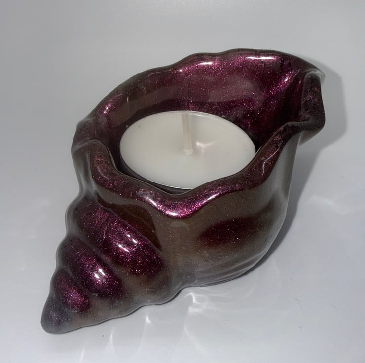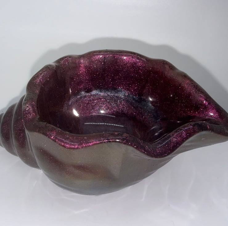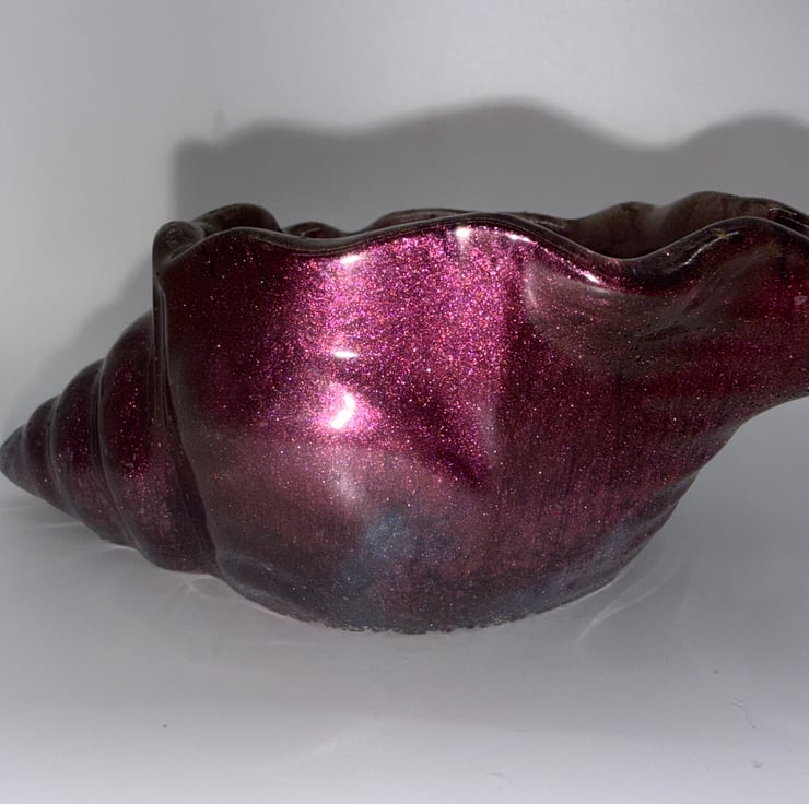 This metallic finish resin seashell sparkles with hues of red and gold and can be used as a trinket / jewellery holder or even for tea lights.