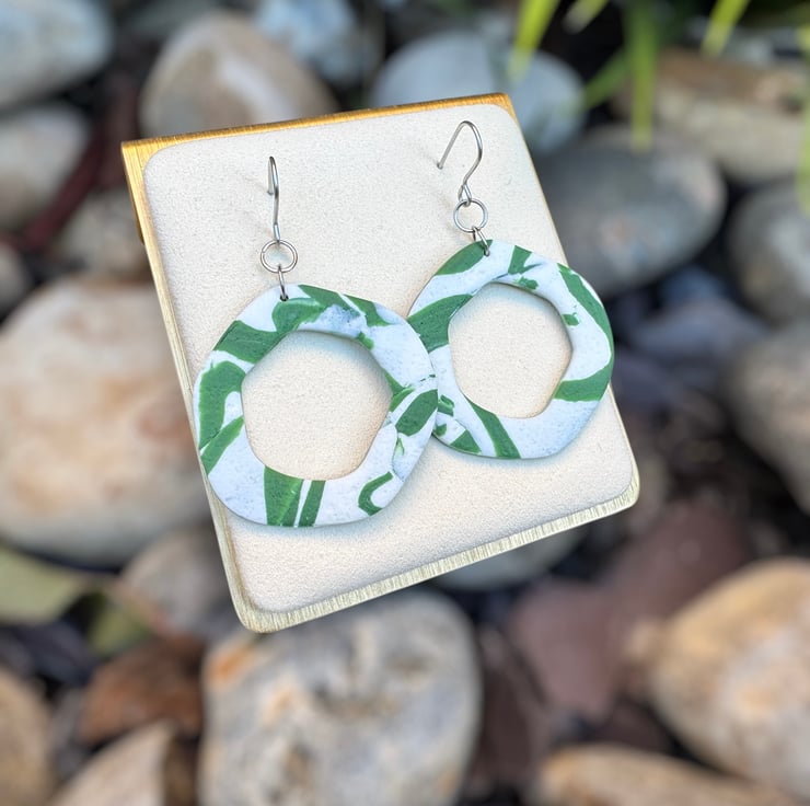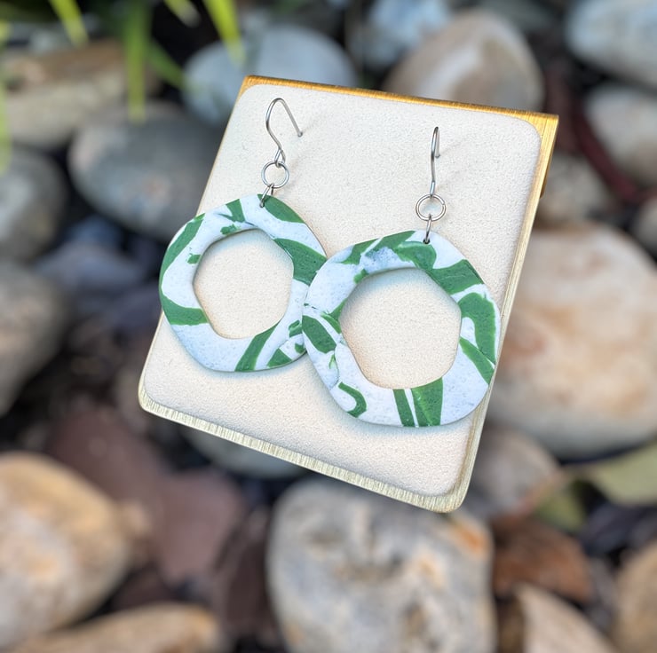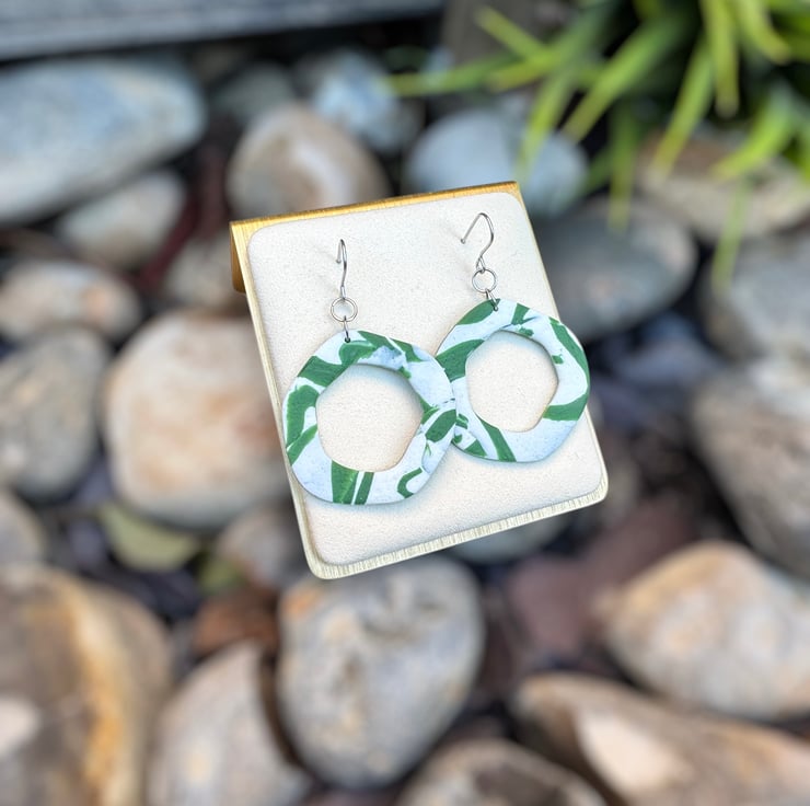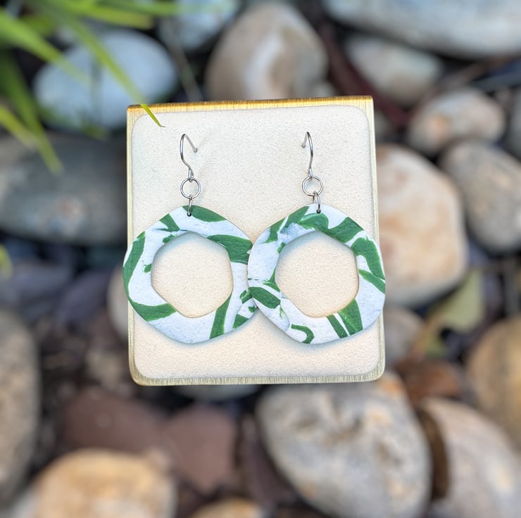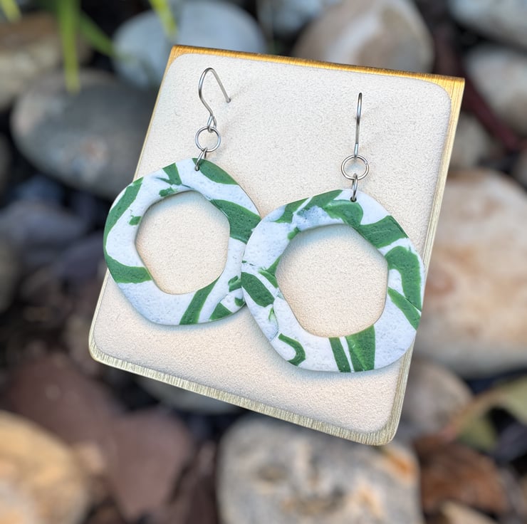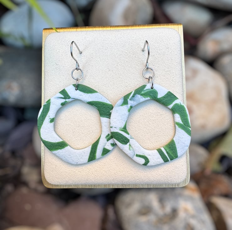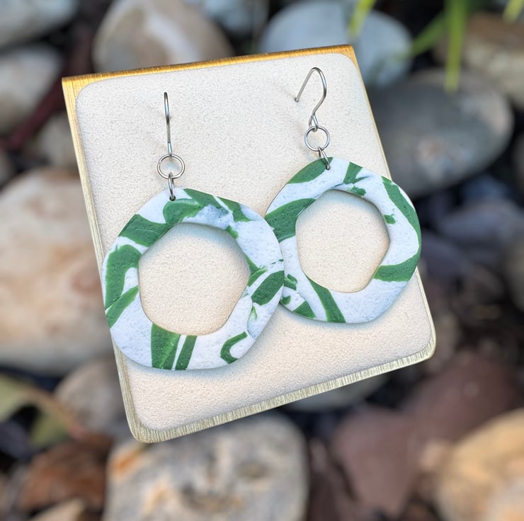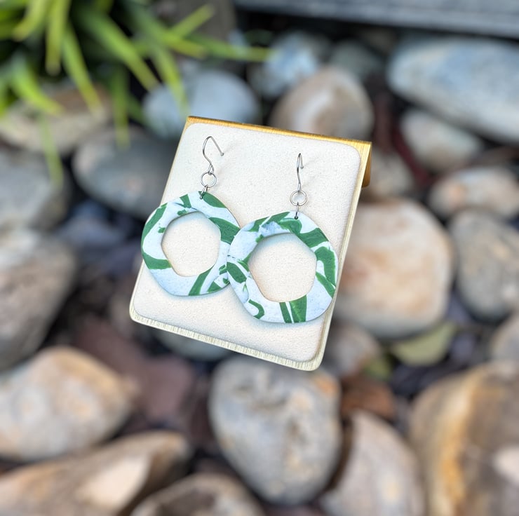 Organic Hoops made from White and Green reworked textured polymer, giving a smooshed shadow styled design.