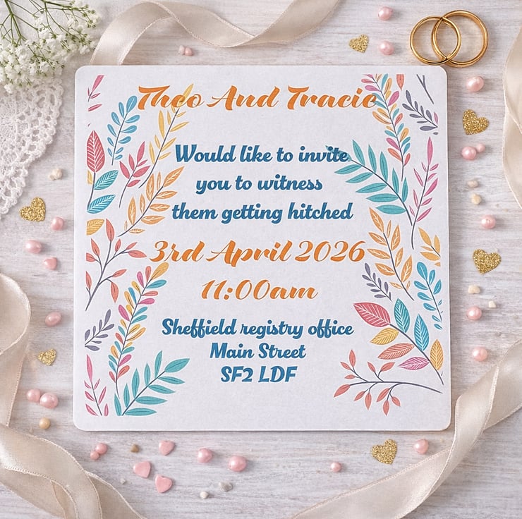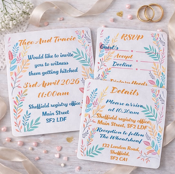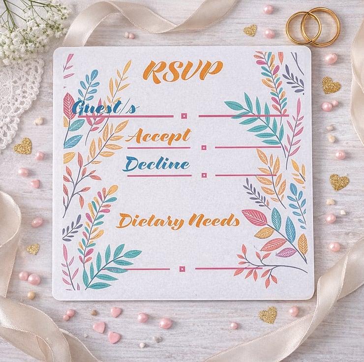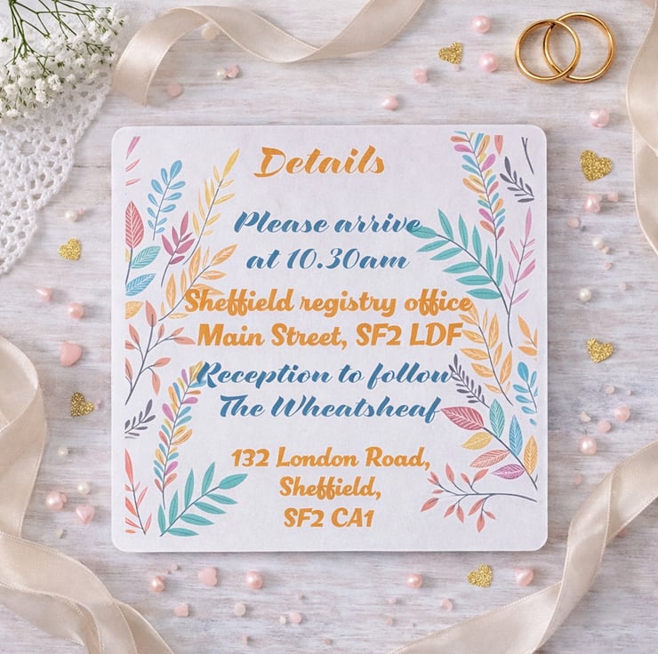Perfect for spring and summer weddings, relaxed celebrations and countryside venues, the Pastel Leaf collection offers a joyful yet timeless look. The details card allows you to share ceremony timings, venue addresses and reception information without overcrowding your main invitation, while the RSVP card keeps guest responses simple and stylish.