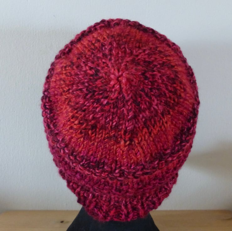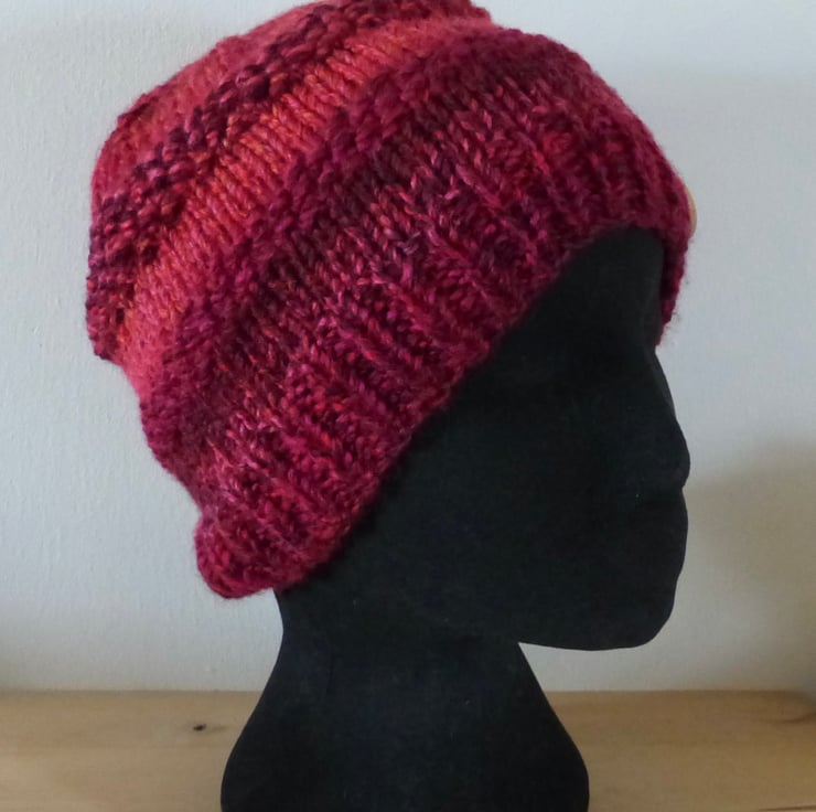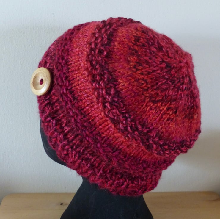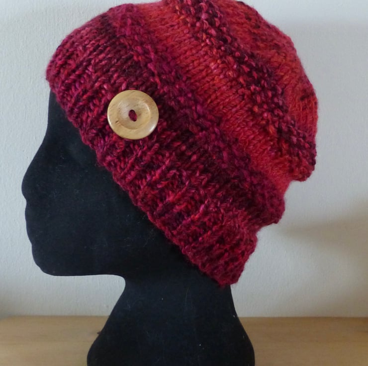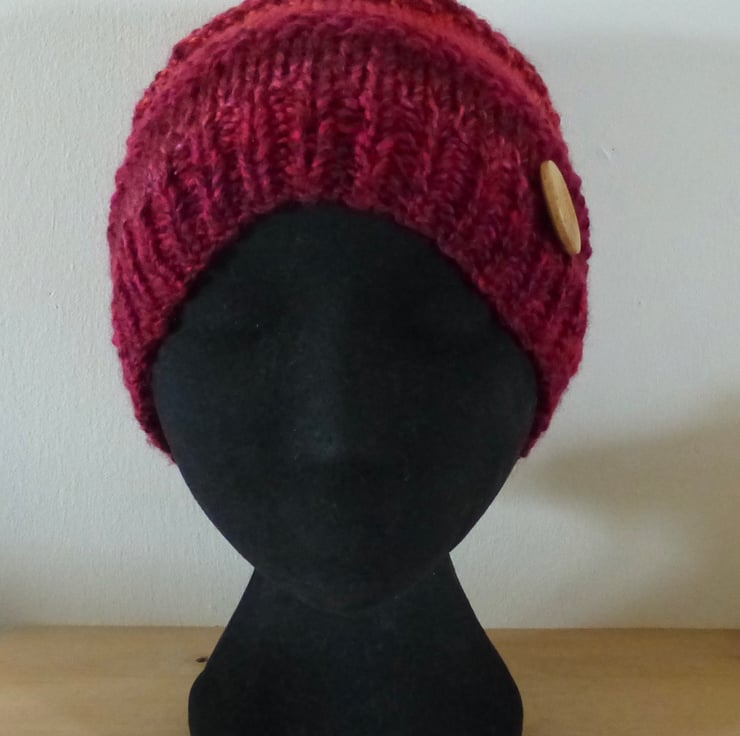 A hand knitted Beanie Hat in a chunky variegated yarn in shades of Red. It measures approximately 44cm around by 22cm in depth and has a large natural wood button just above the rib for decoration.