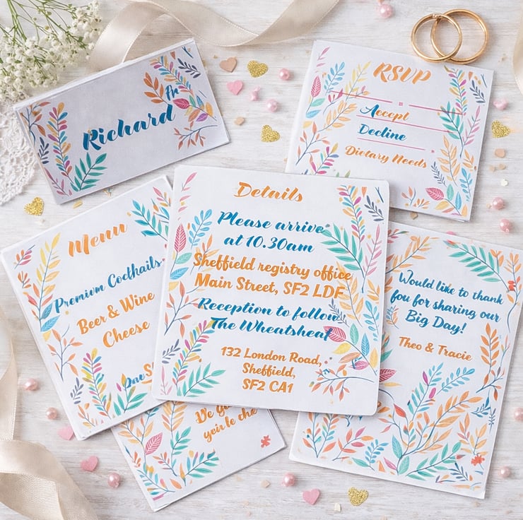 Perfect for spring and summer weddings, the Pastel Leaf menu card works seamlessly alongside the matching stationery collection. Coordinating invitations, RSVP cards, details cards, place name cards and table stationery are available to create a cohesive wedding day style.