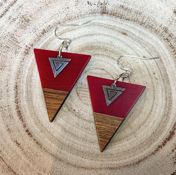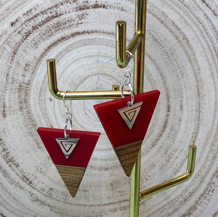 Deep red resin and walnut wood triangle design earrings featuring stainless steel mini trianlge maize charms on silver plated ear wires. Alloy and nickle free.