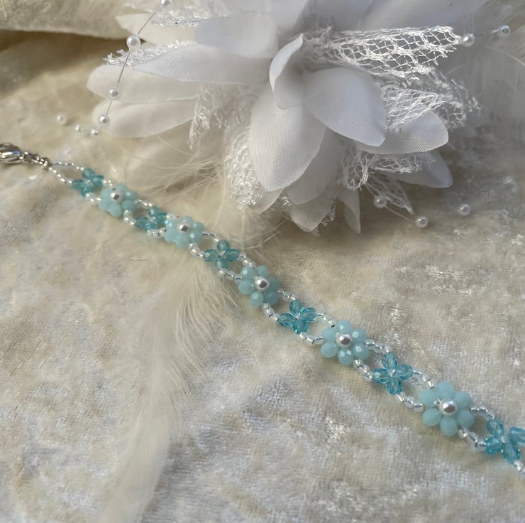 The Pale Blue Flowers Bracelet is a handmade beaded featuring a beautiful flower design with glass beads. Perfect for weddings or any special occasion, this adjustable bracelet is a unique and stylish piece of jewellery. Approximately 8mm wide and 16cm long plus 2.5cm of extension.