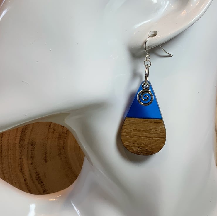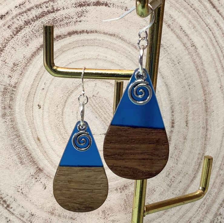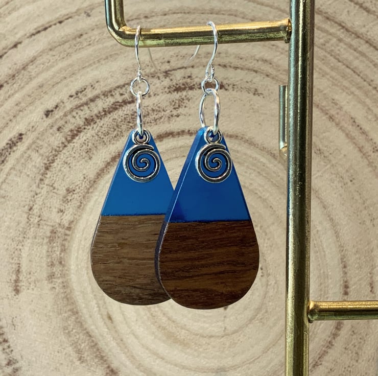 Midnight blue resin and walnut wood teardrop design earrings featuring mini white metal spiral charms on silver plated ear wires. Alloy and nickle free.