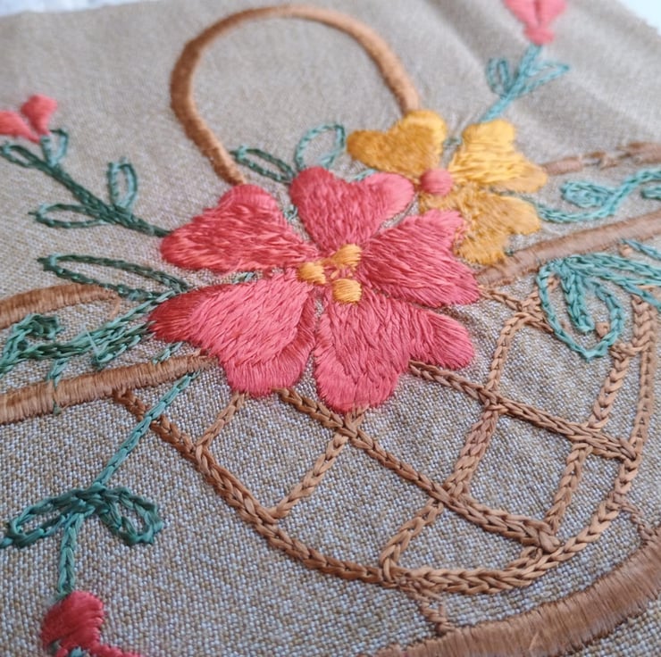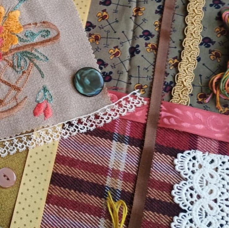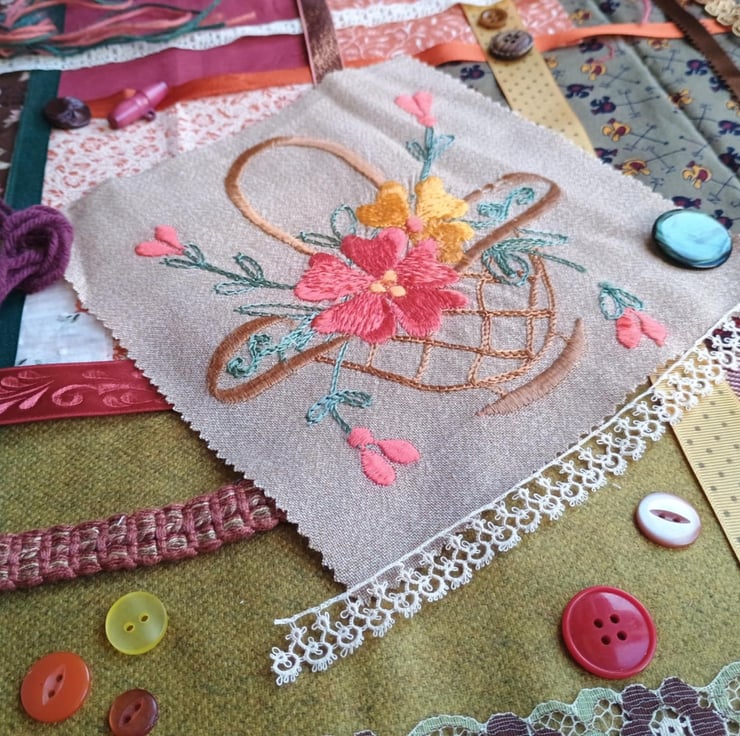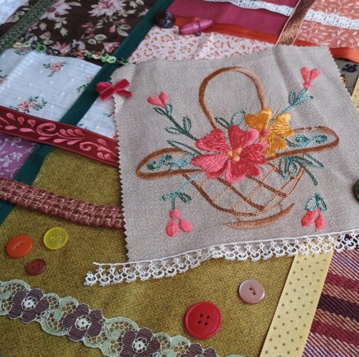 Flower basket - the centre piece of this beautiful fabric bundle is a vintage piece with an embroidered basket of flowers. I've paired it up with vintage, pre-loved and factory waste textiles, haberdashery and trims in co-ordinating colours.