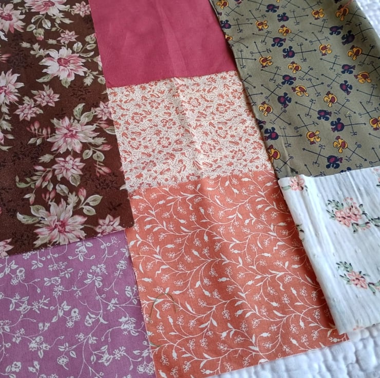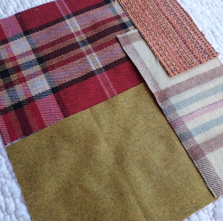 Strong red, gold, and orange tones, balanced with plum-pink, green, brown and cream - this would be glorious as an autumn themed textile art picture or cozy cushion. Or use the pieces in a slow stitched project.