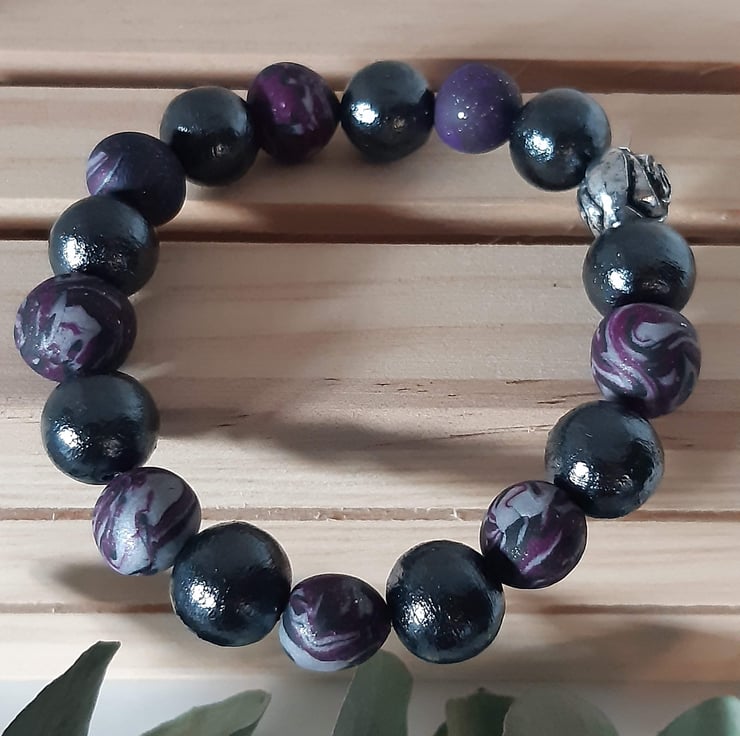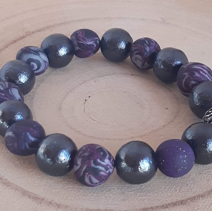 A handmade bracelet featuring polymer clay beads in rich dark purple, silver and black, with a subtle hint of sparkle. Each bead is individually crafted, making every bracelet truly one of a kind.
