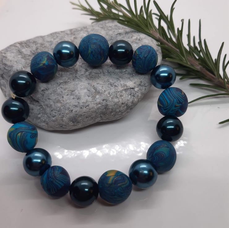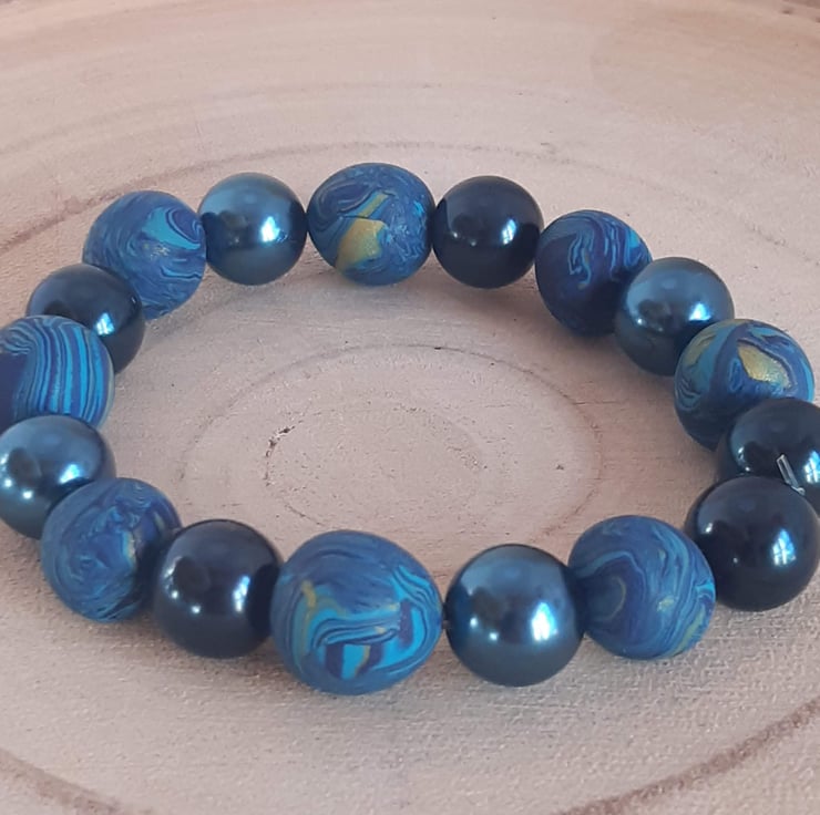 The polymer clay beads measure approximately 12.6mm and are interspersed with 11.6mm navy blue shiny glass beads. The bracelet measures around 7.2 inches (18.3cm) and is threaded onto stretchy elastic cord for a comfortable, easy fit.