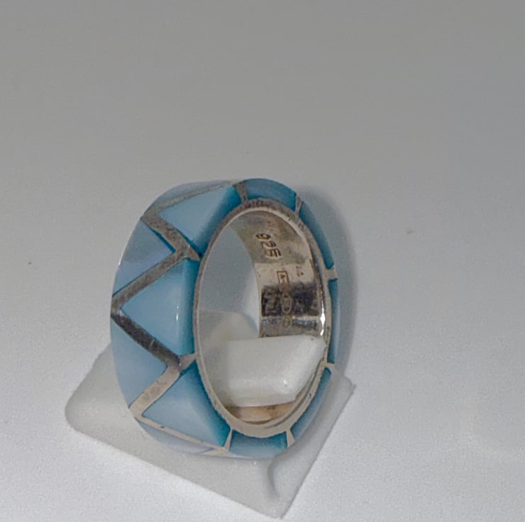 A beautiful chunky mother of pearl ring set in sterling silver with a zig zag pattern.