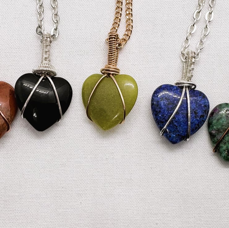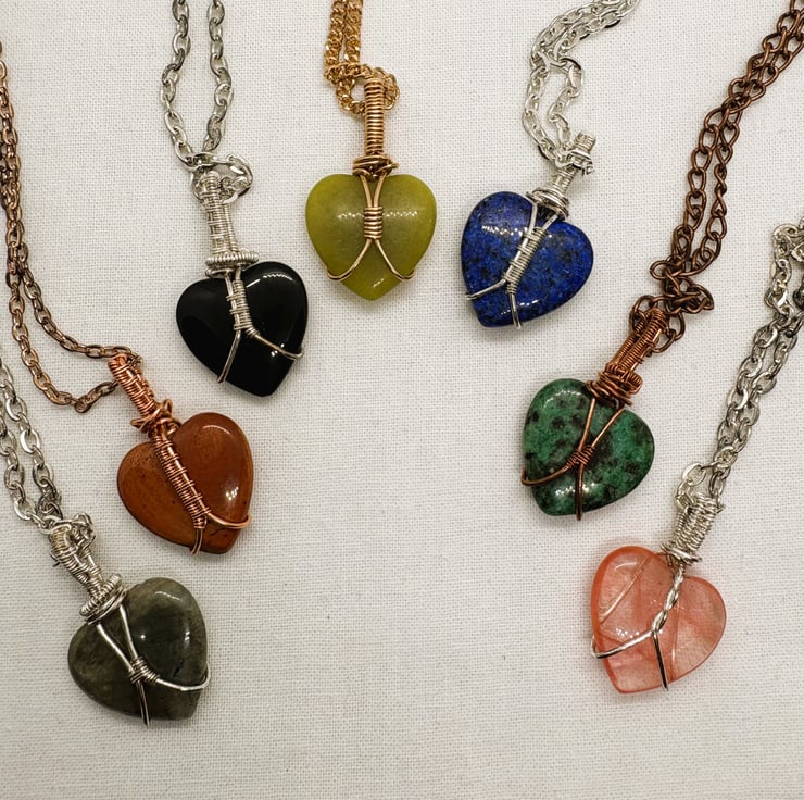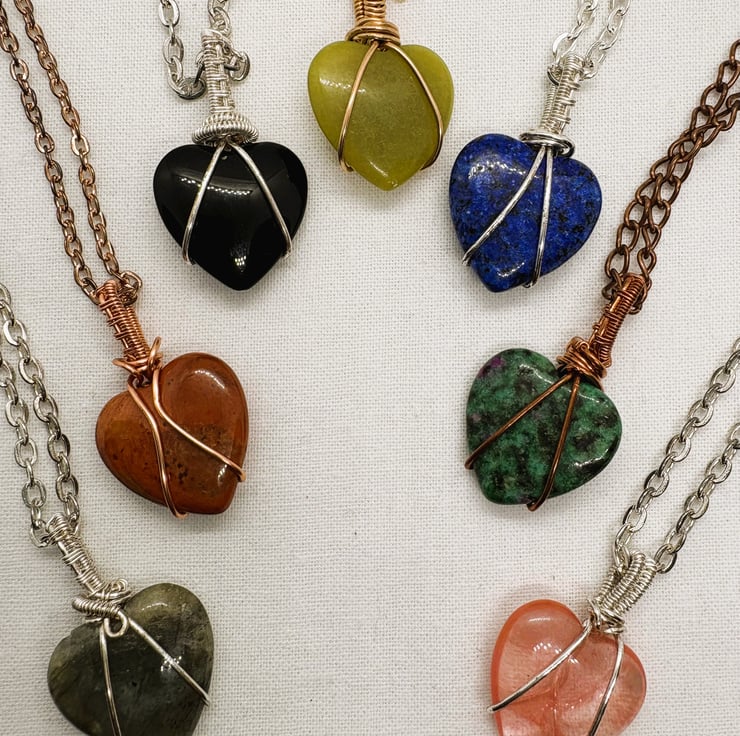 Each heart shaped stone is 20 x 20mm and is hand wire-wrapped in various different metals.