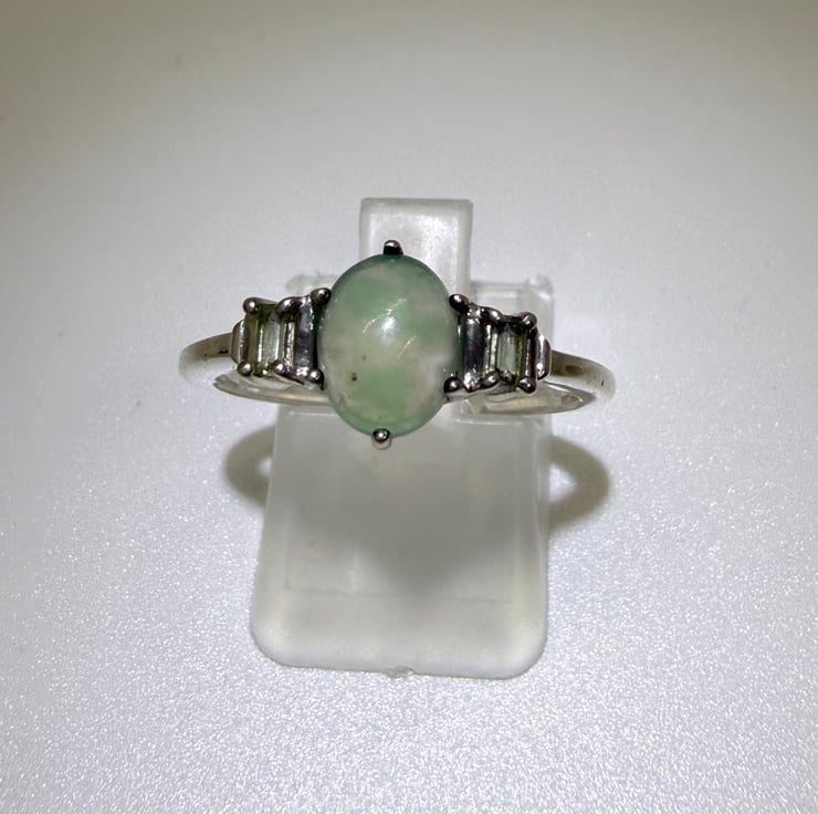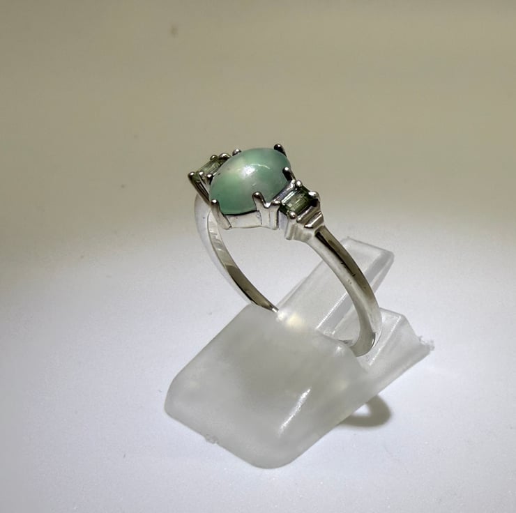 This beautiful, large, oval shaped Chalcedony (a type of Quartz) sits alongside stunning green gems set in a sterling silver band.