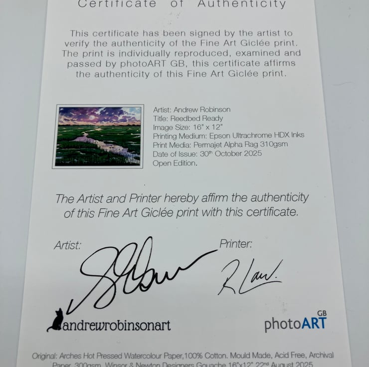 The framed print comes with a 'Certificate of Authenticity' which documents the details of the original painting and the art print. The Certificate of Authenticity is affirmed with a signature from both myself (the artist) and the printer.