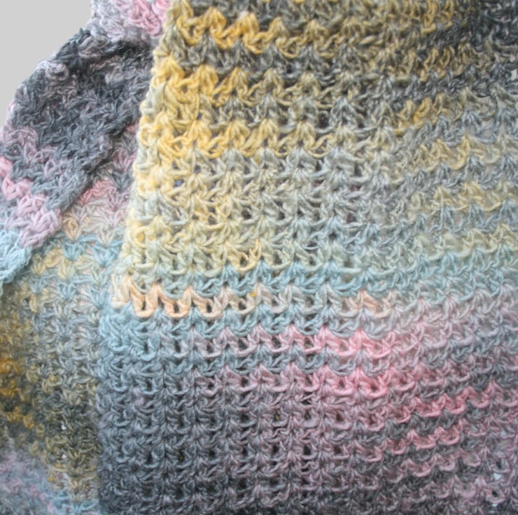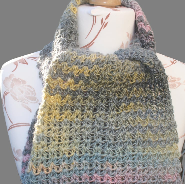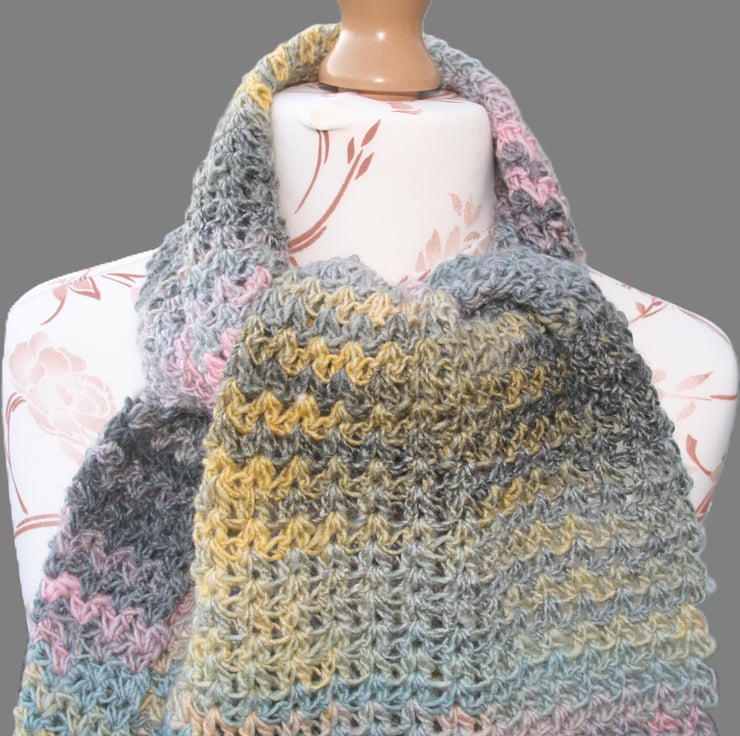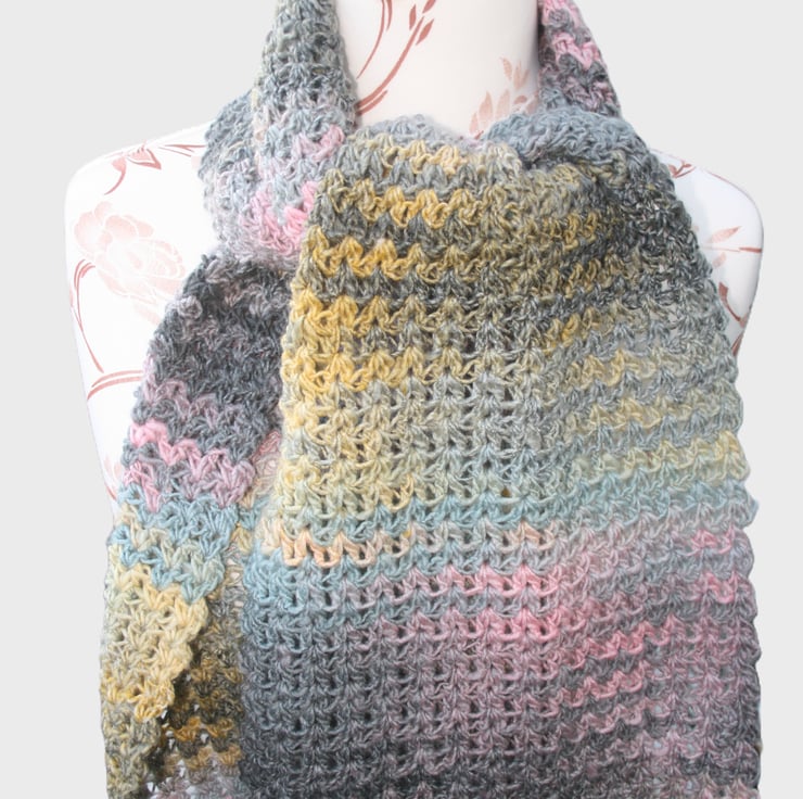 A very lovely colourful and cheerful scarf, ideal for a cold wintry day. The soft scarf has a beautiful yellow, pink, grey and pale blue throughout. Made with kind permission of the original pattern designer. The scarf measures approximately 64 inches (L) by 10 inches (W).