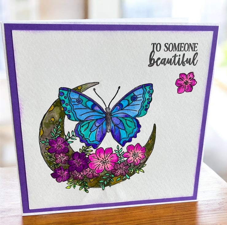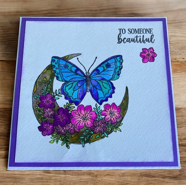 This 6 x 6 inch square card features a delicately hand-stamped butterfly and moon design in elegant shades of grey. The image features beautiful floral elements, individually hand painted using watercolours in soothing shades of blue, purple, and pink. The gentle blend of colours adds depth and movement.