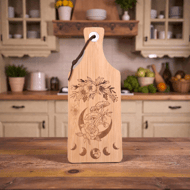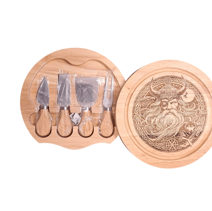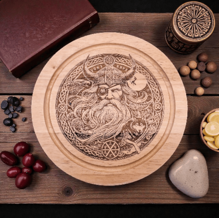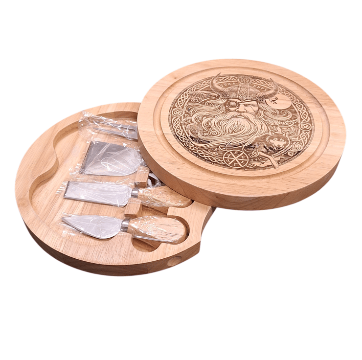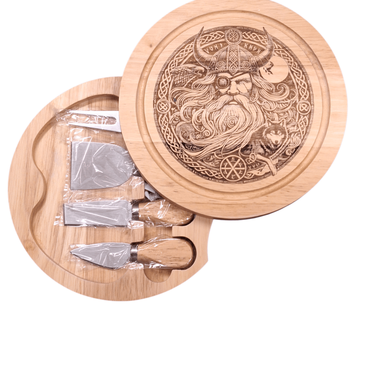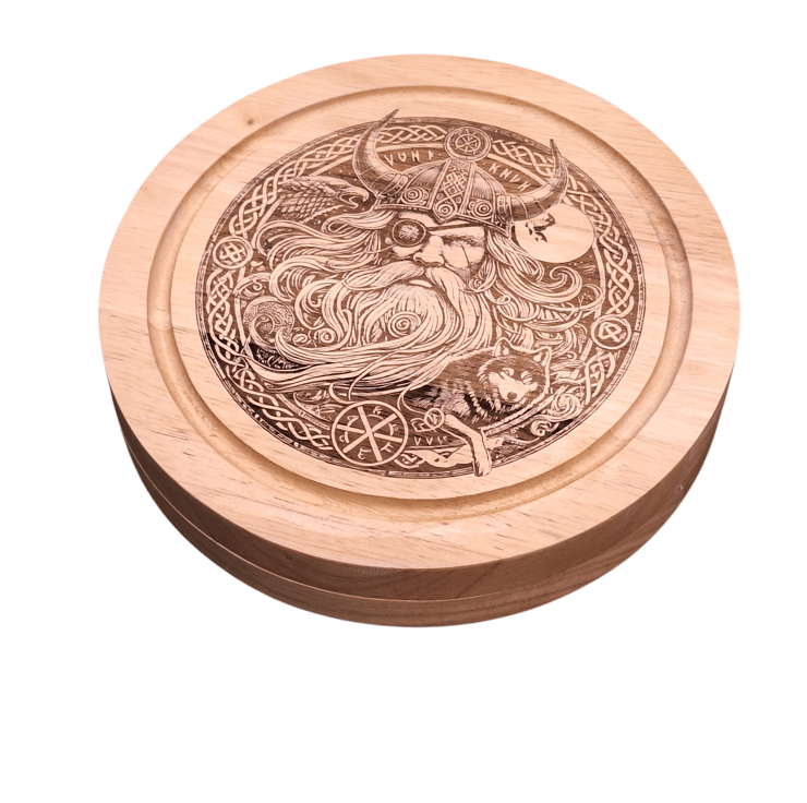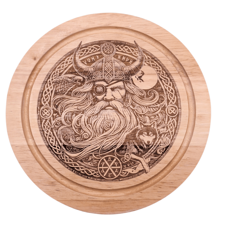 This compact Odin cheeseboard is inspired by traditional Norse folklore and the quiet beauty of old carved wood. The detailed engraving features Odin surrounded by flowing knotwork, giving the piece a timeless, story-rich feel that suits both rustic and contemporary homes.