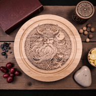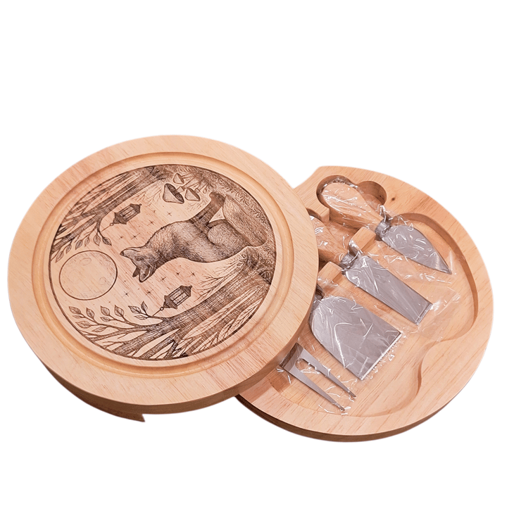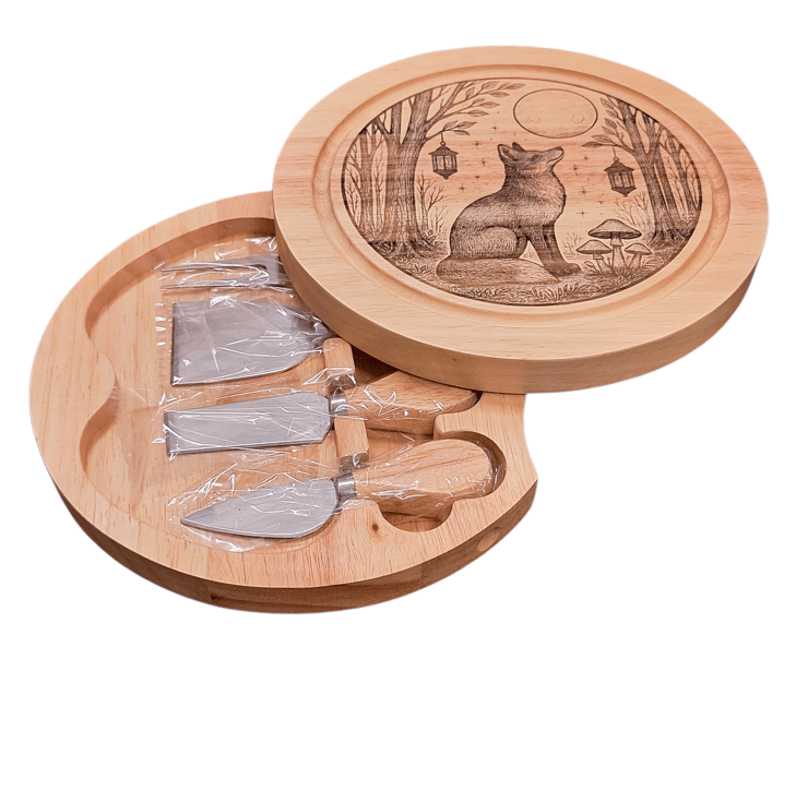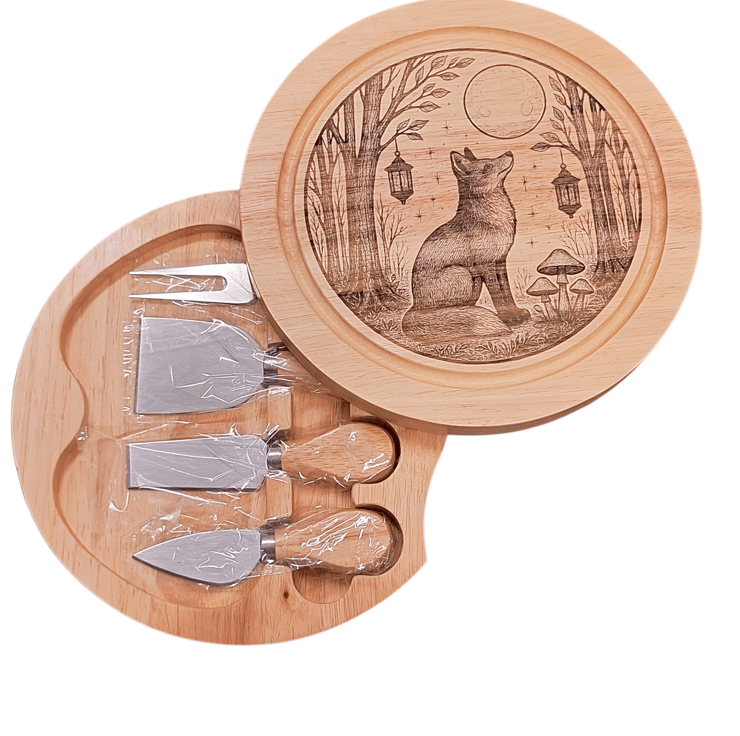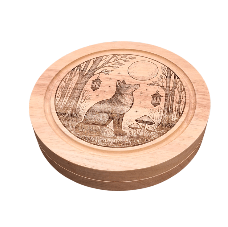 This fox compact cheeseboard is inspired by quiet woodland evenings and the gentle magic of folklore. The engraved design features a fox gazing beneath the moon, surrounded by trees, lantern light and forest details, giving the piece a calm, storybook feel.