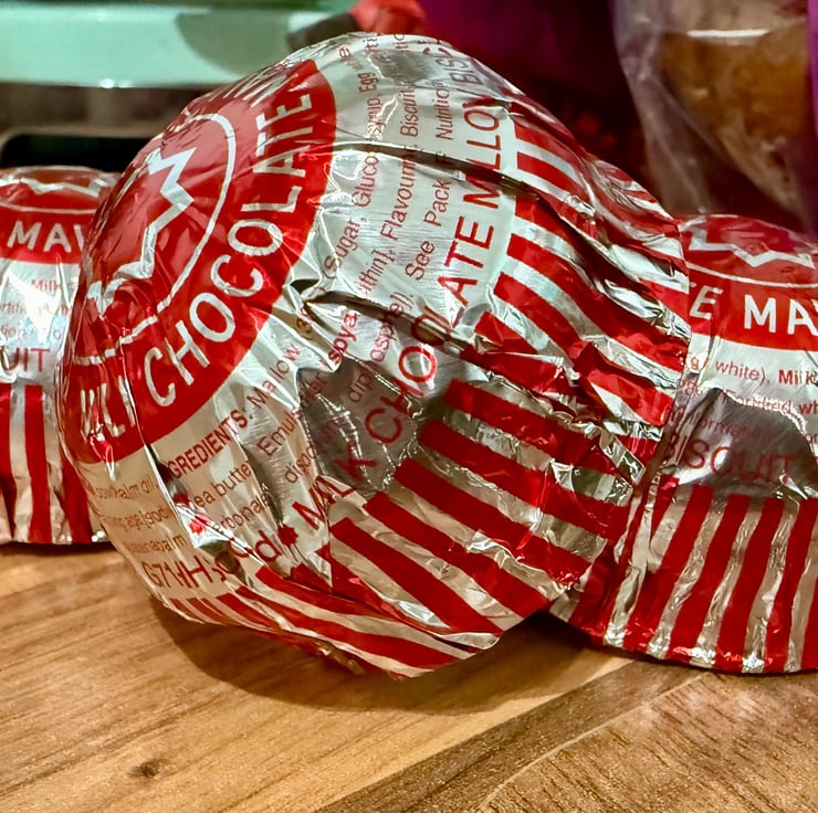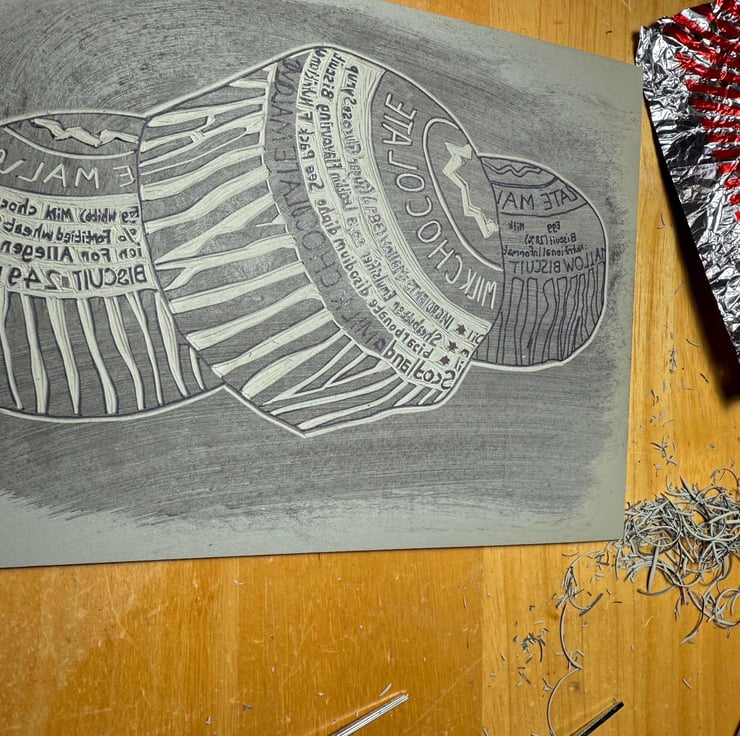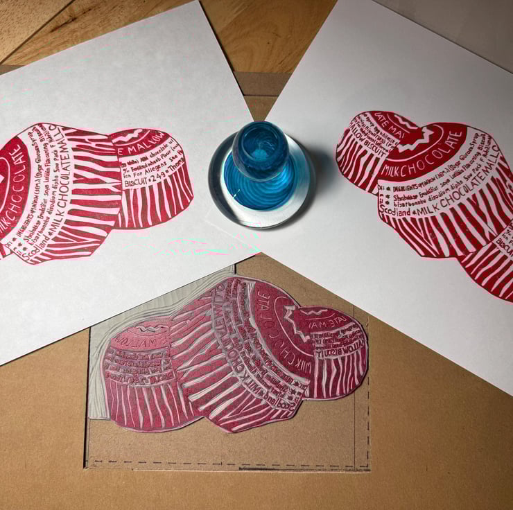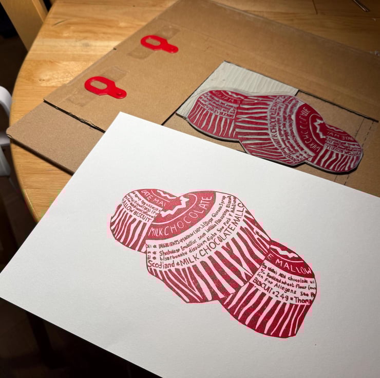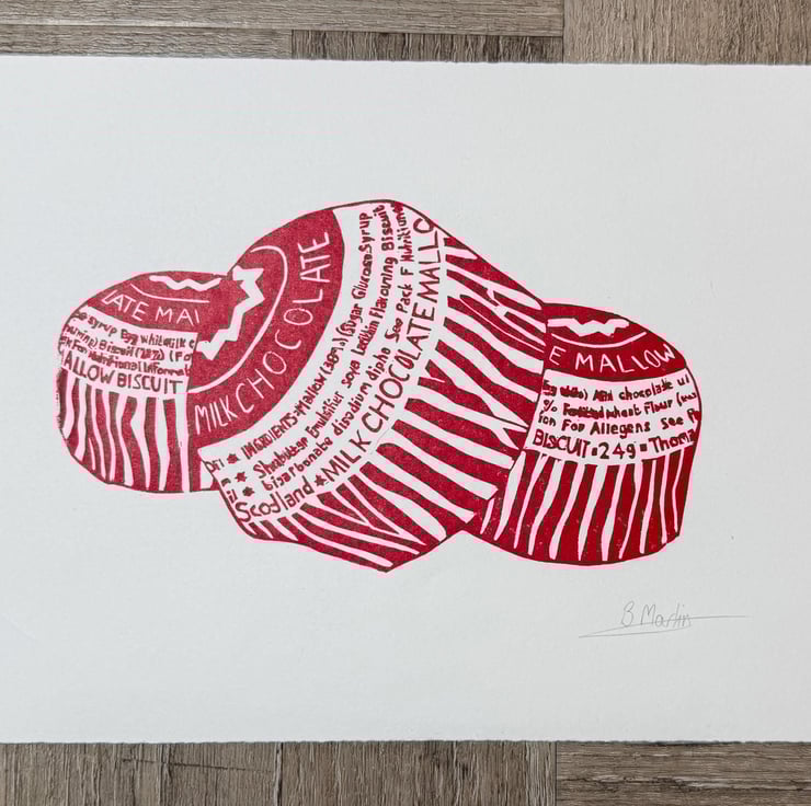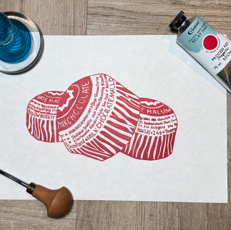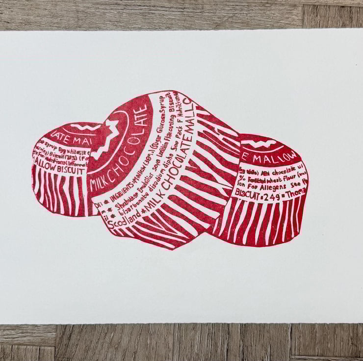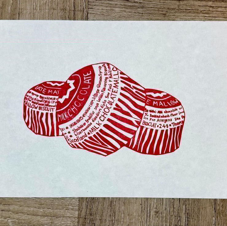 A hand burnished block print of a lino cut taken from my original sketch and photo of some Tunnocks teacakes.