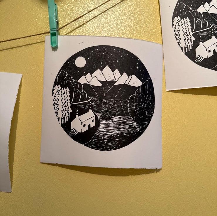A hand burnished print of a lino cut taken from my original drawing.