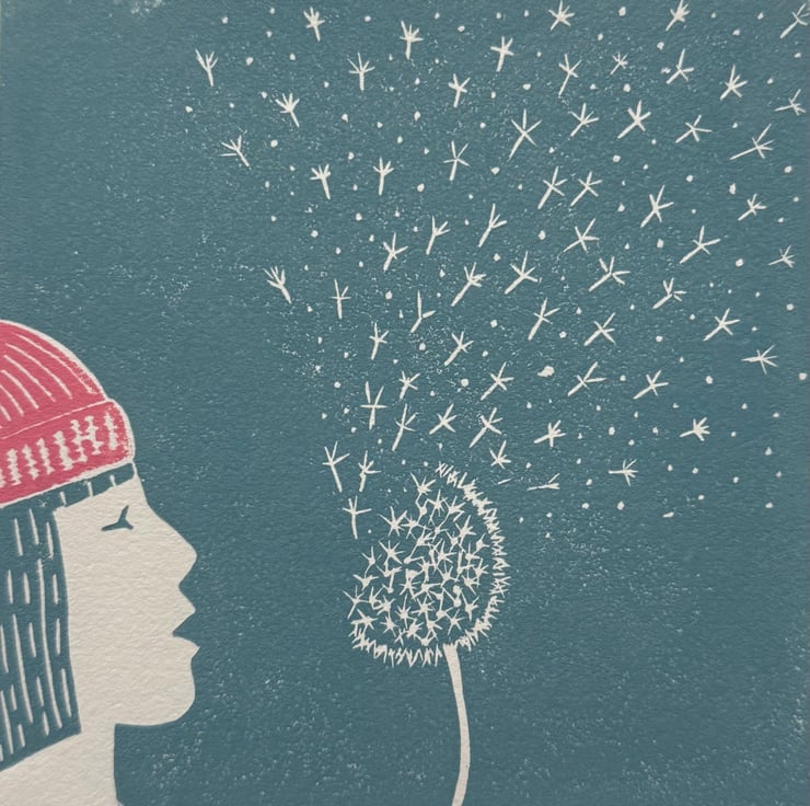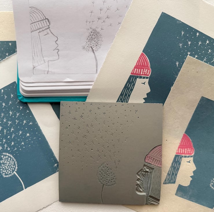 A hand burnished print of a lino cut taken from my original sketch idea, shown in the photos.