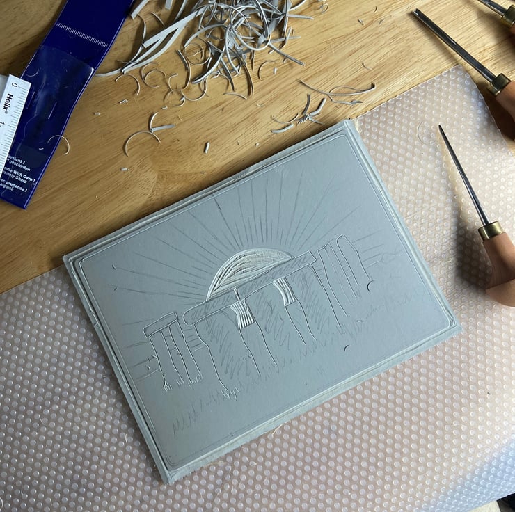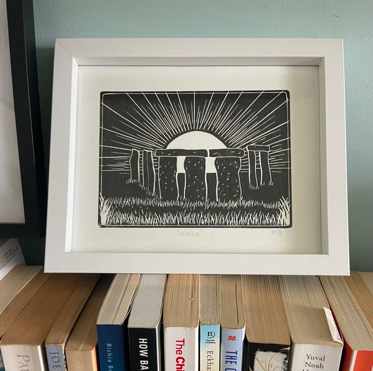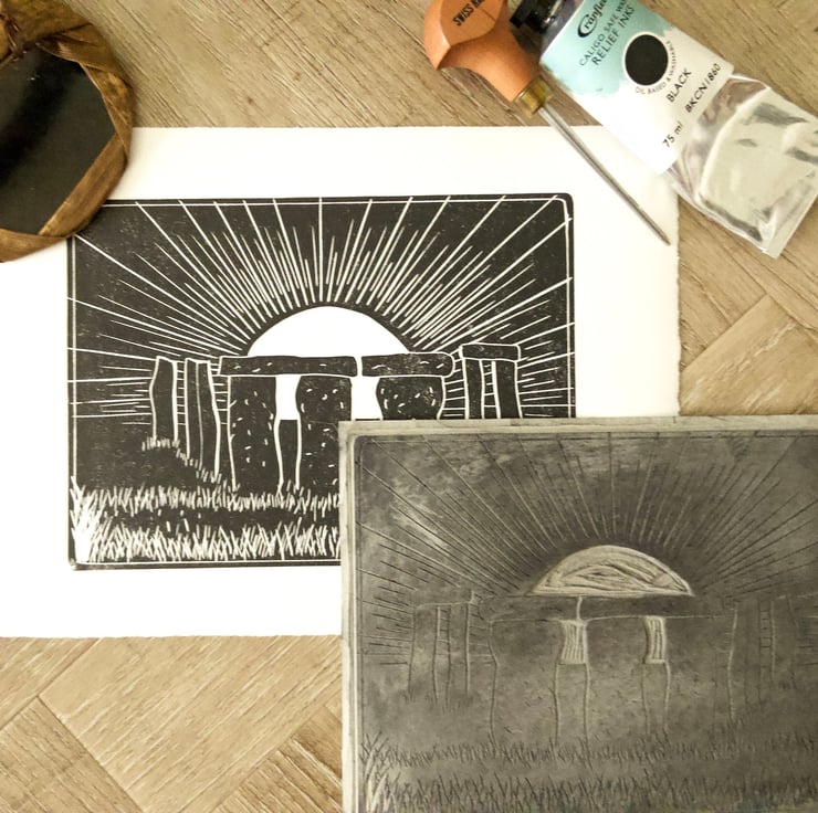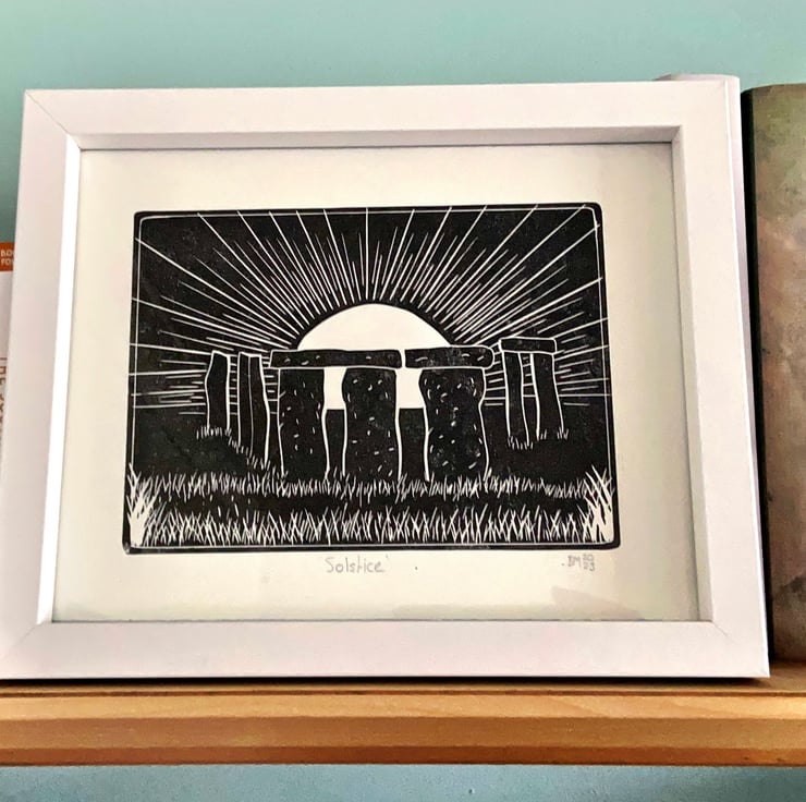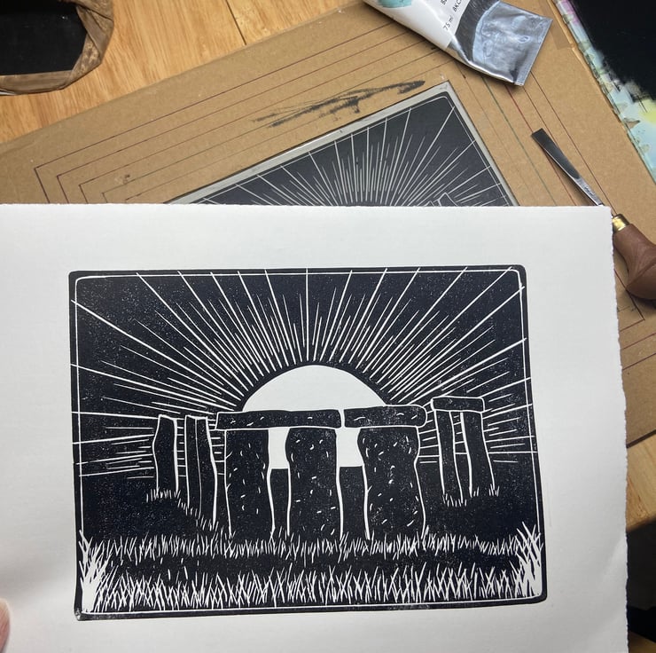A hand burnished print of a lino cut taken from my original sketch of solstice at Stonehenge.