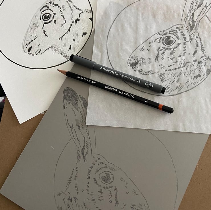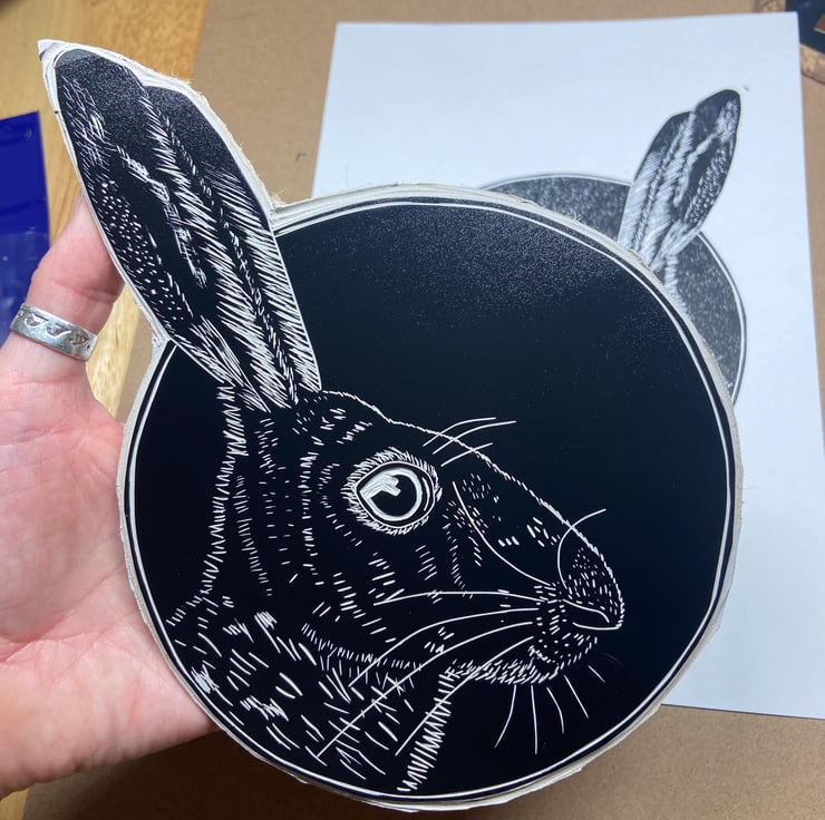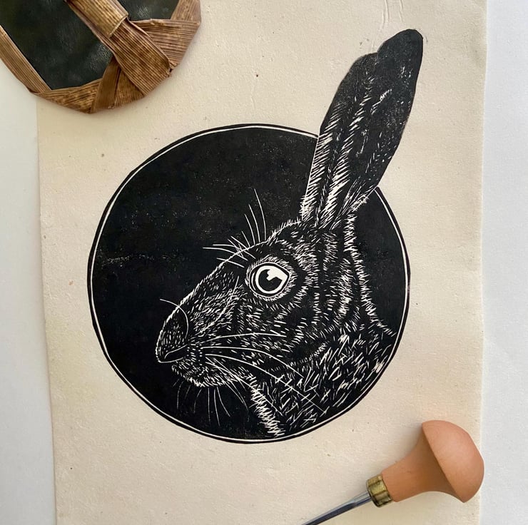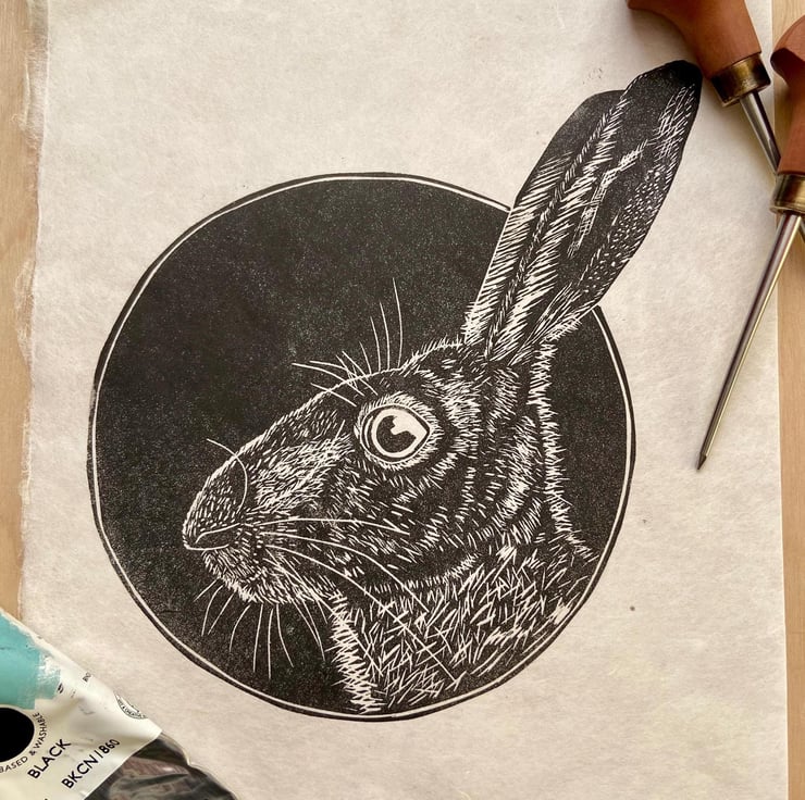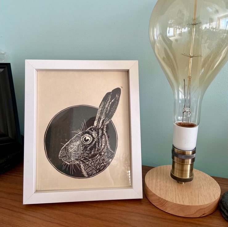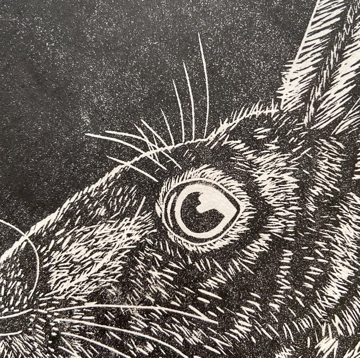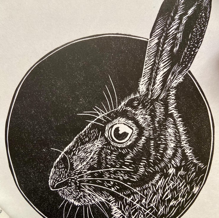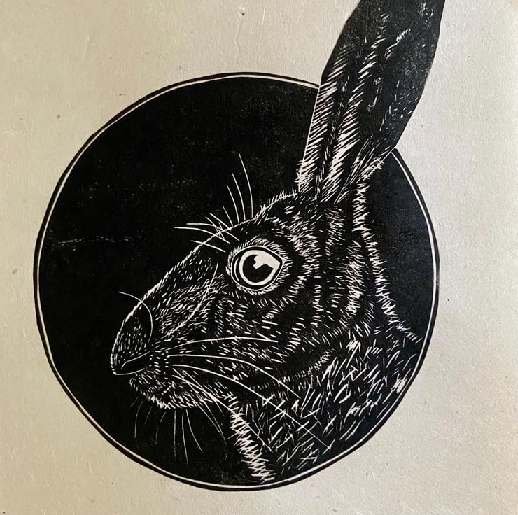 A hand burnished print of a lino cut taken from my original sketch of a hare, one of my favourite animals.