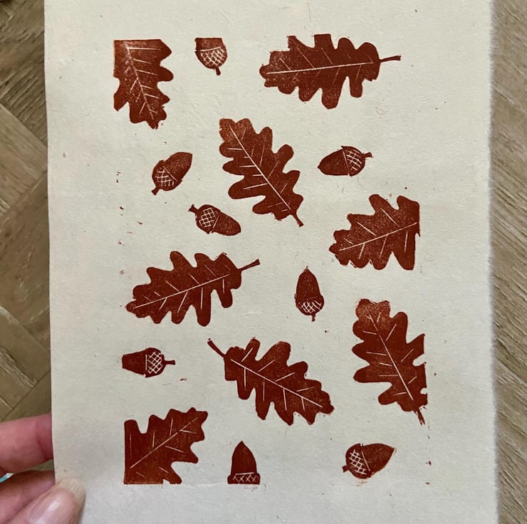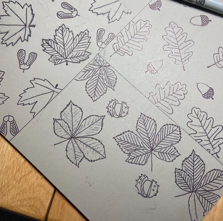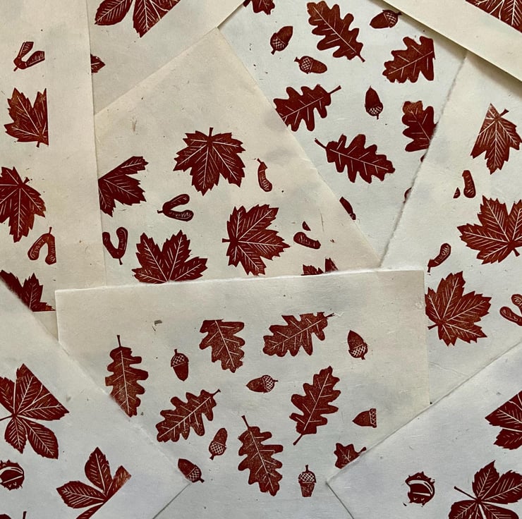 A set of 3 hand burnished prints of a lino cut taken from my original sketches of oak leaves and acorns, sycamore leaves and seeds and horse chestnut leaves and conkers.