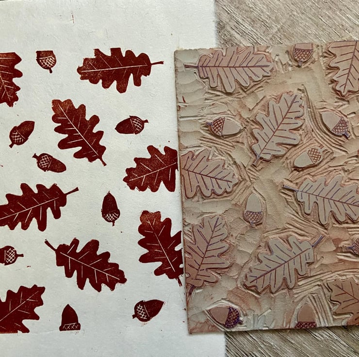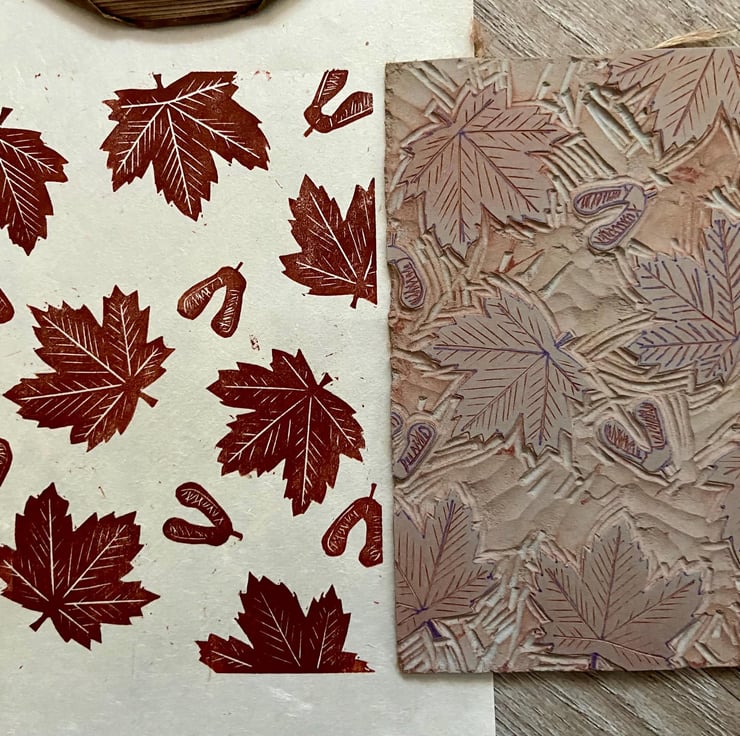 Set of 3 - Falling leaves Linoprints Oak, Sycamore and Chestnut : Hand-Burnished