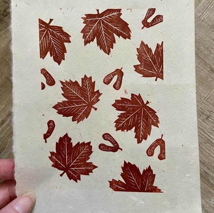 A hand burnished print of a lino cut taken from my original sketch of sycamore leaves and helicopters.