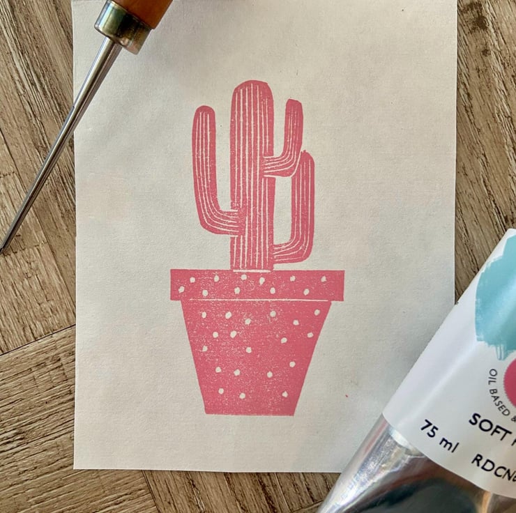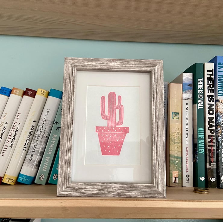 This lovely little print is a hand burnished lino cut taken from my original sketch of an Arizona cactus.