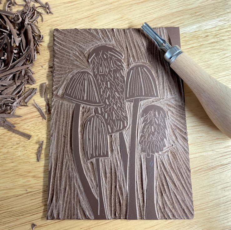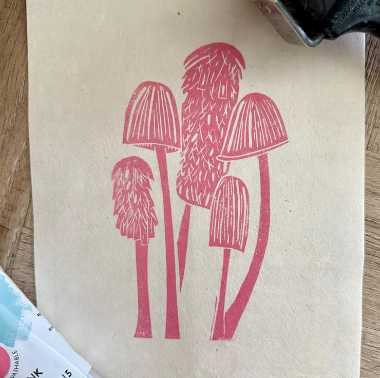 A hand burnished print of a lino cut taken from my original sketch of a selection of mushrooms.