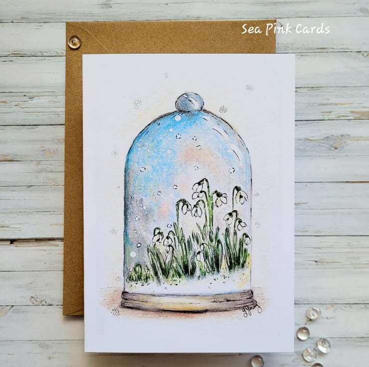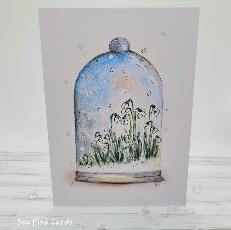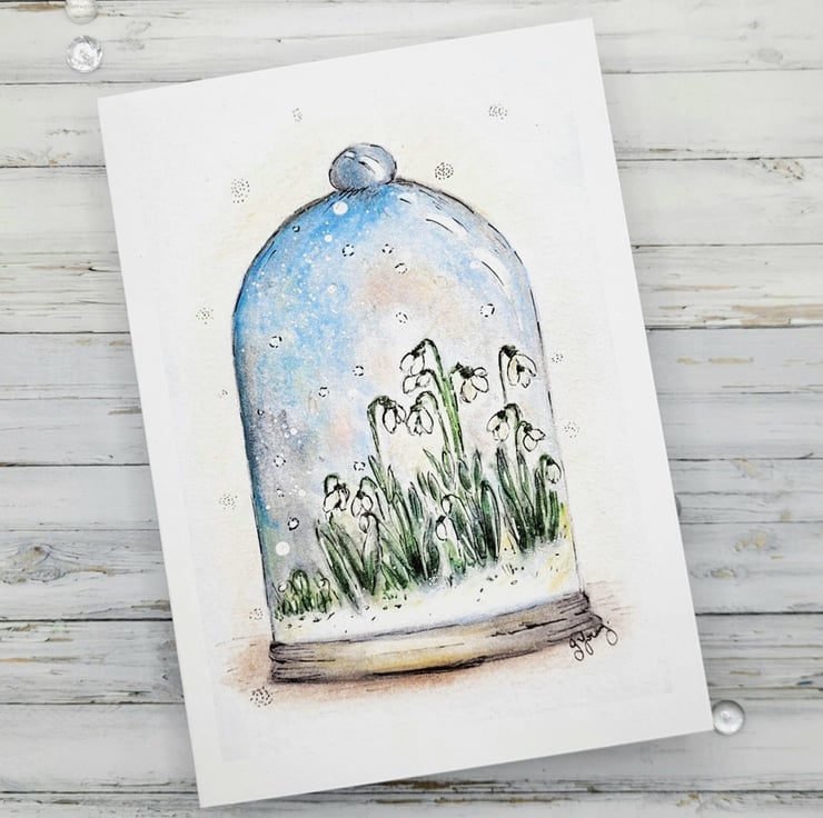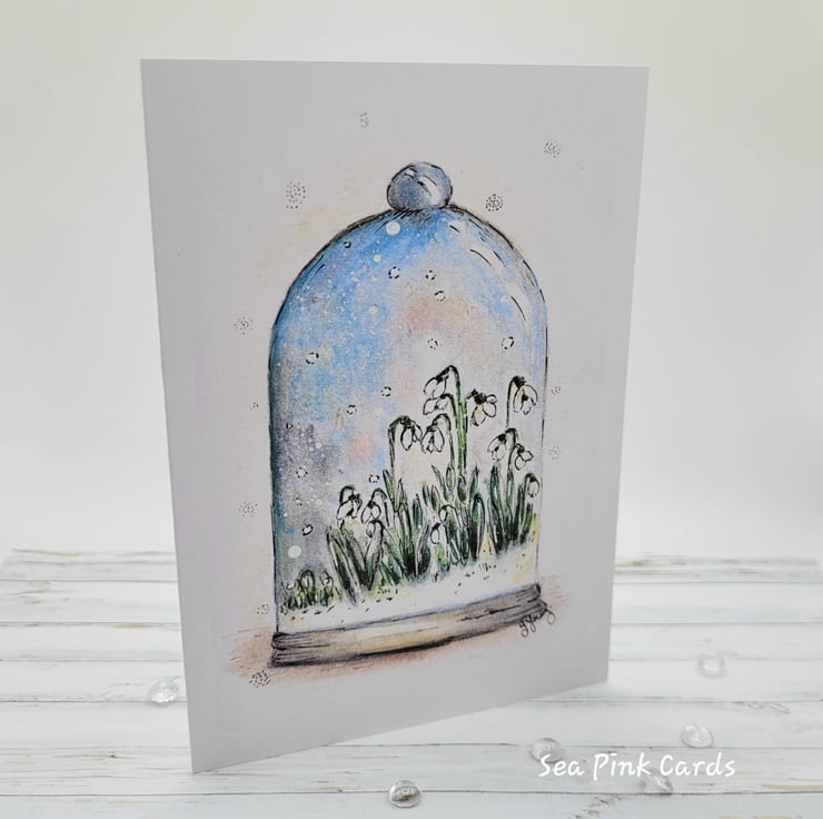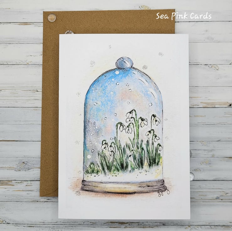 The card has been printed onto 300gsm white heavyweight cardstock, for a lovely smooth finish. I was inspired to draw snowdrops because I love the beauty of these simple flowers and love that they represent renewal and hopefully the start of the end of winter. In my imagination, I wanted to pop them under glass, so I drew a little protective cloche too!!