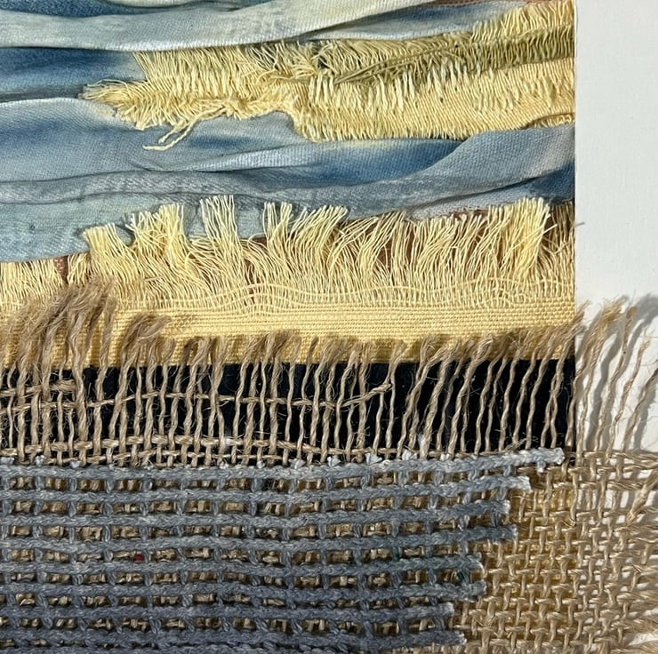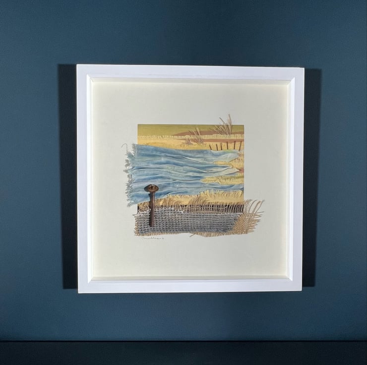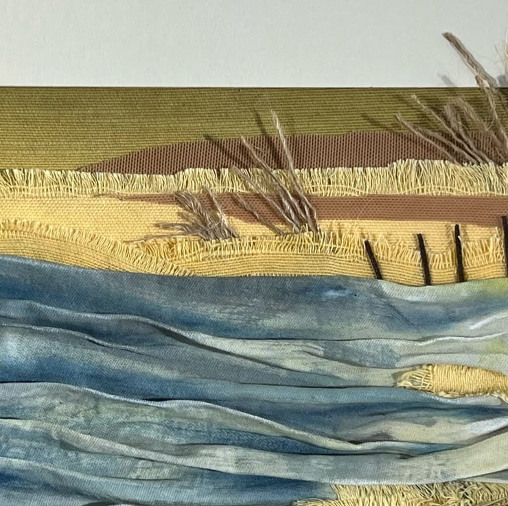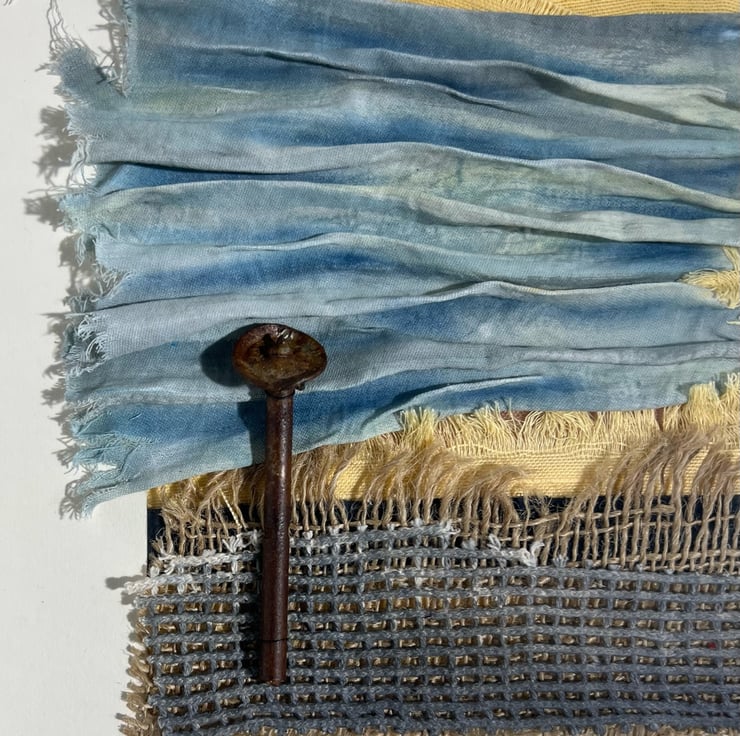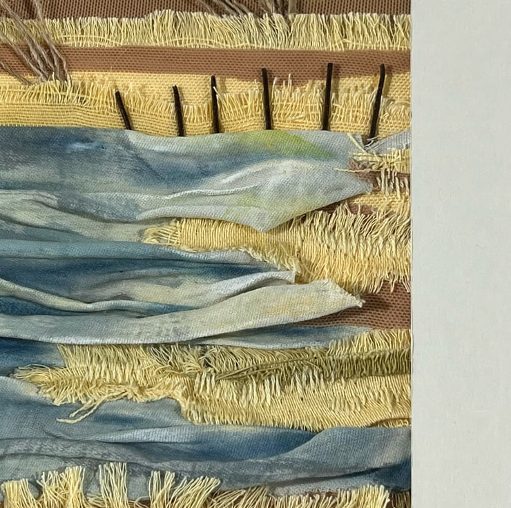 I have used painted fabric, embroidery and found objects in this work. The rust was found on one of my many walks, I have painted the fabric and embroidered over to convey a sense of movement and depth.