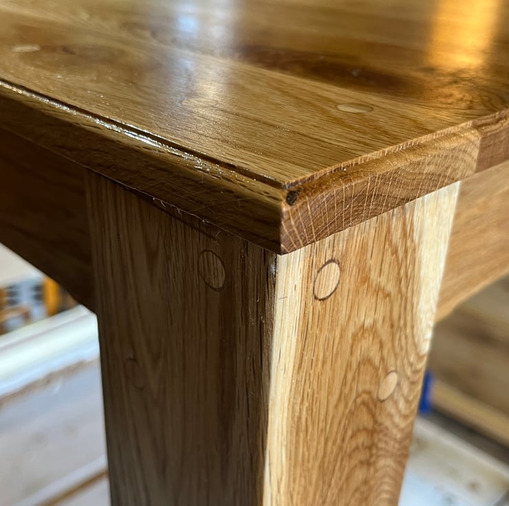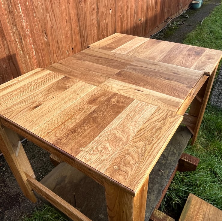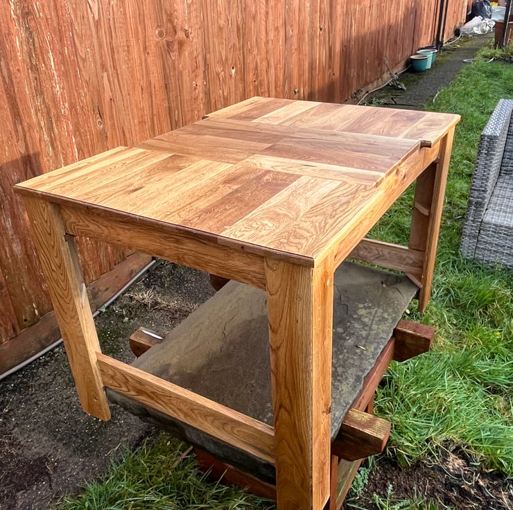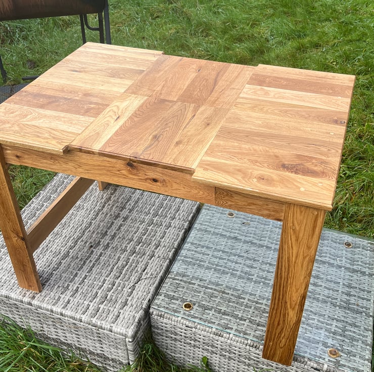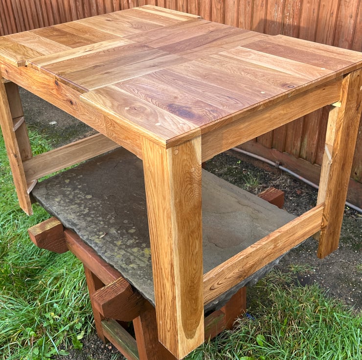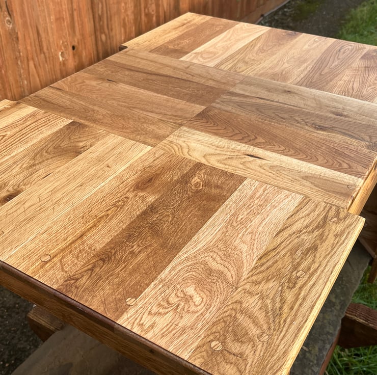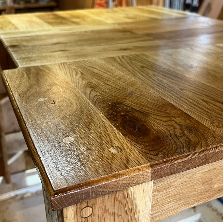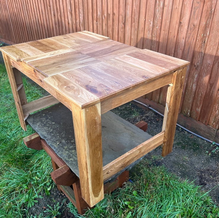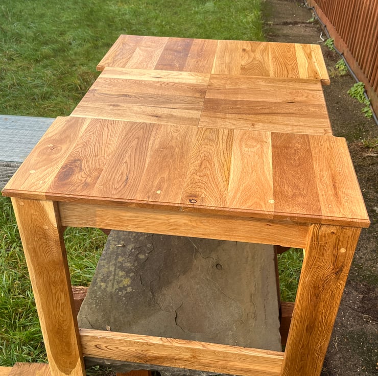The oak has been laid out on the top to give a distinctive pattern. It’s been treated with a finishing oil which gives it good protection against spills and stains.