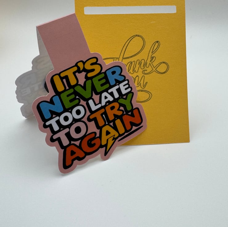 Turn every page with encouragement and hope! This uplifting “It’s Never Too Late to Try Again” magnetic bookmark is a gentle reminder that fresh starts are always possible. With bold, colorful lettering and a cheerful design, it adds positivity to your reading, planning, or study time.