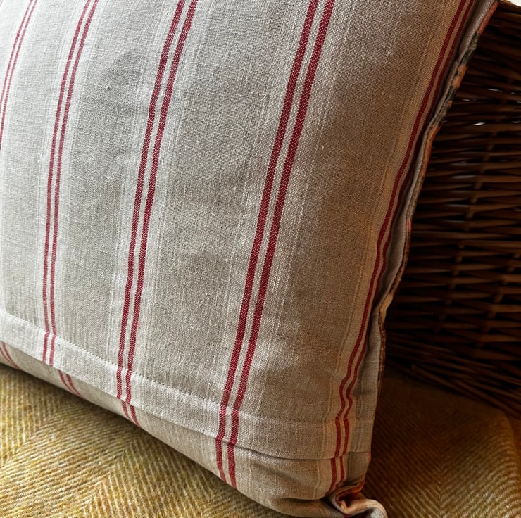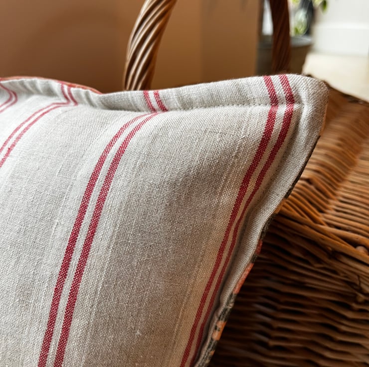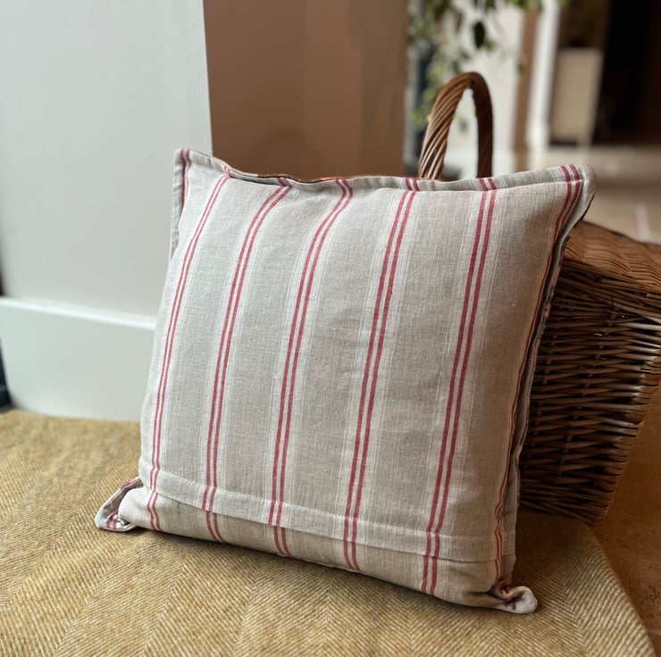 The cover is backed with striped linen and has a narrow Oxford edge and a concealed zip. It is designed to fit an 18” or 45cm filler (not included). It measures approximately 17” square.