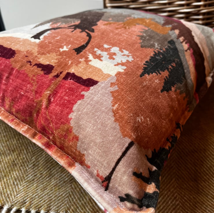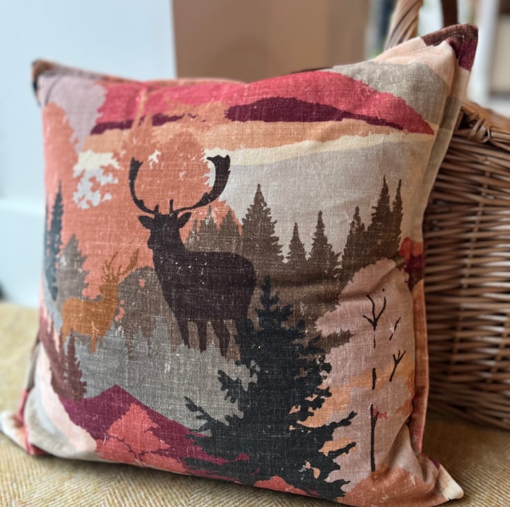 Beautiful velvet cushion cover made from richly patterned reclaimed velvet. Two stags are silhouetted against a forest and mountain backdrop in stunning warm colours of burgundy, terracotta, brown and cream.