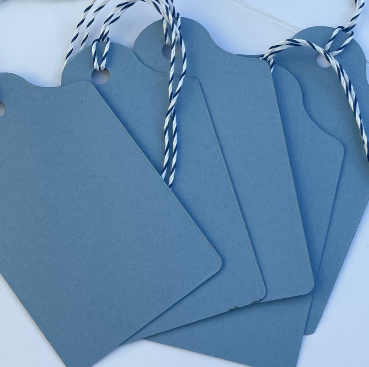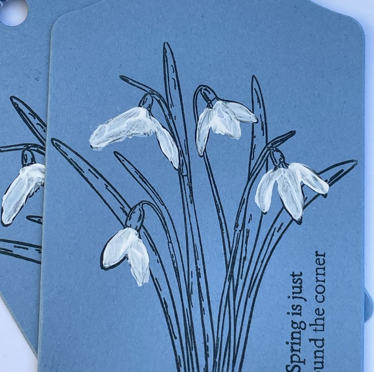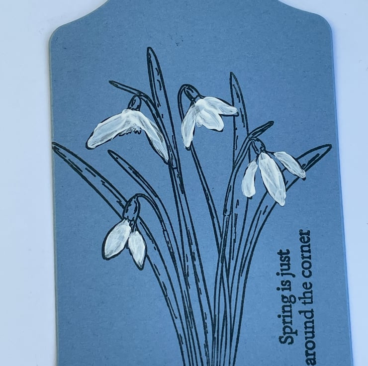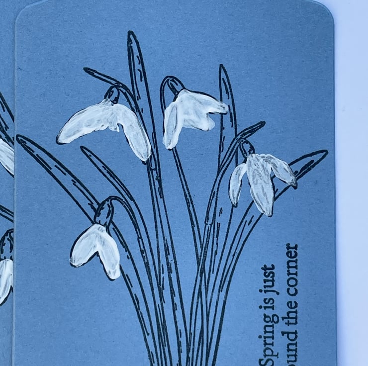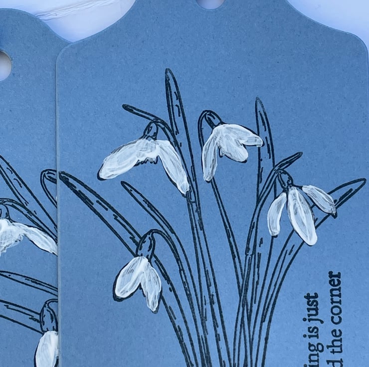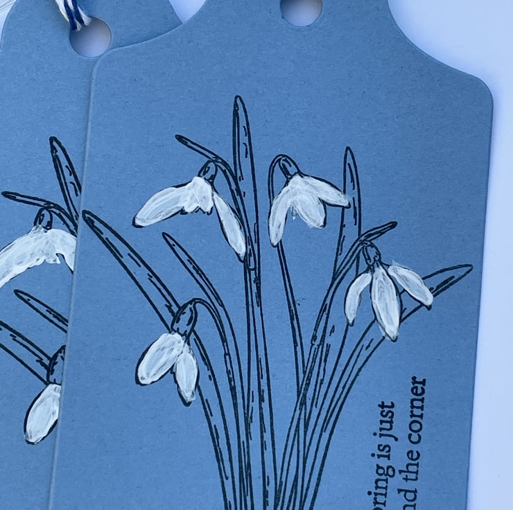 A lovely set of 5 Snowdrop gift tags. These gift tags are 11.5x7cm in size and come with bakers twine ties. They are in a denim blue blue card and are stamped with a bunch of snowdrops. These are simply stamped in black ink and have the flowers hand coloured in white Gesso. The sentiment says Spring is just around the corner, something to look forward to. Ideal for gifts, crafting or scrapbooking. Plenty of room for your own greeting on the back.