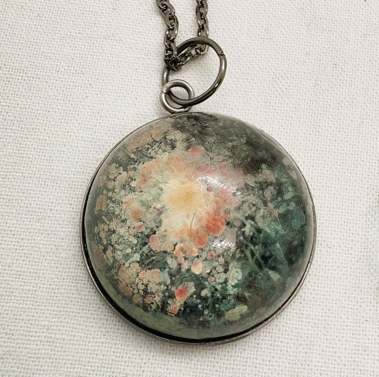Gun metal coloured stainless steel chain with a stainless steel circular bezel holding a dome shaped resin cast 'universe' pendant, 3cm diameter.