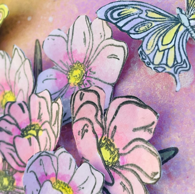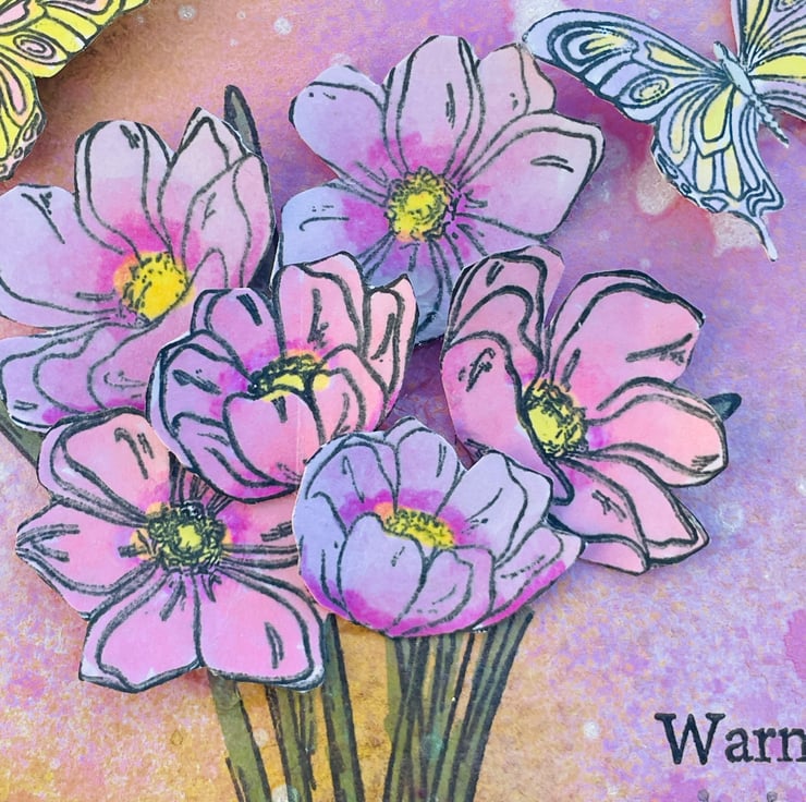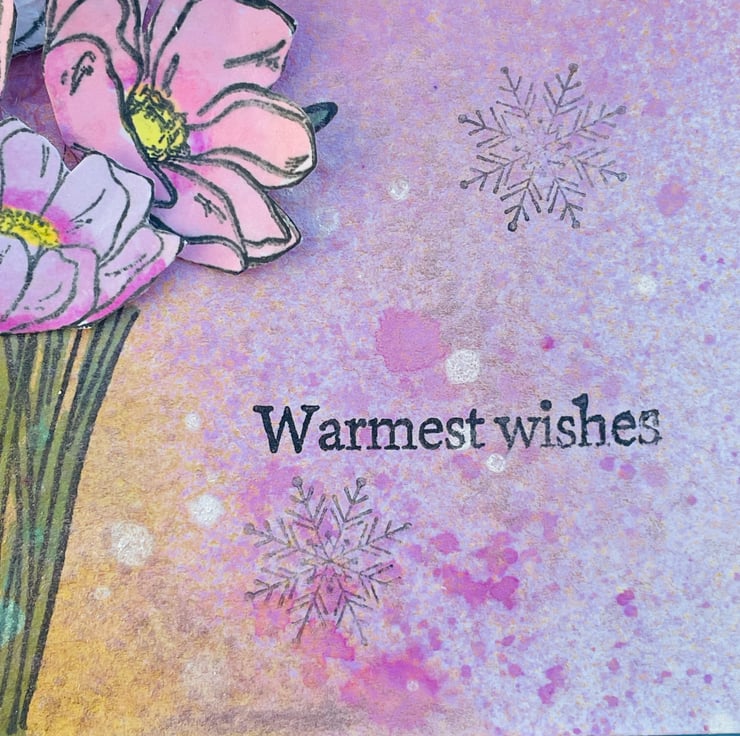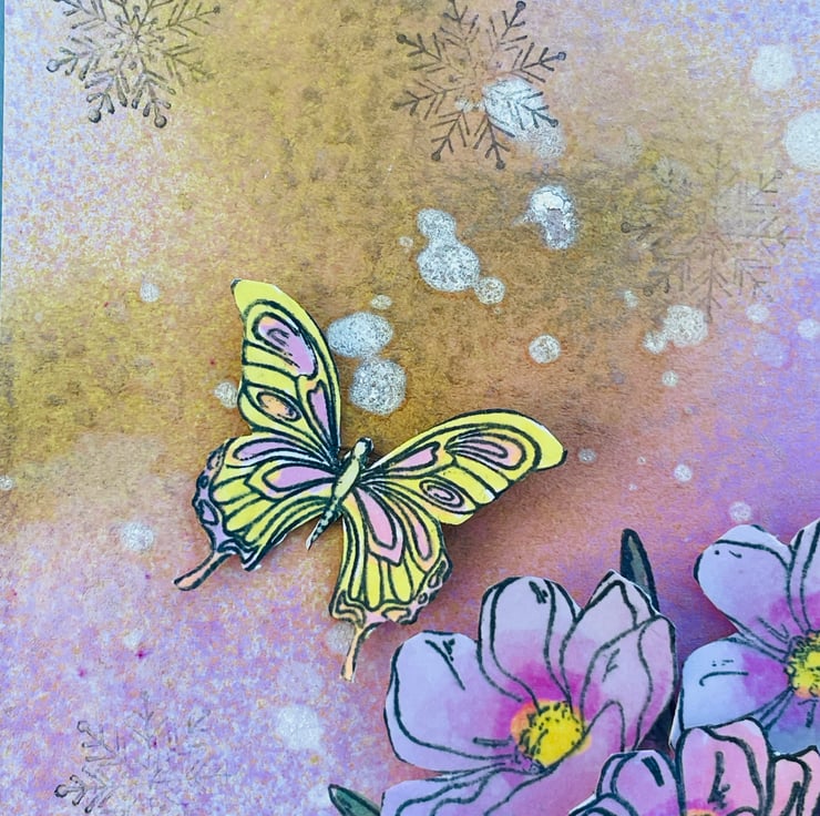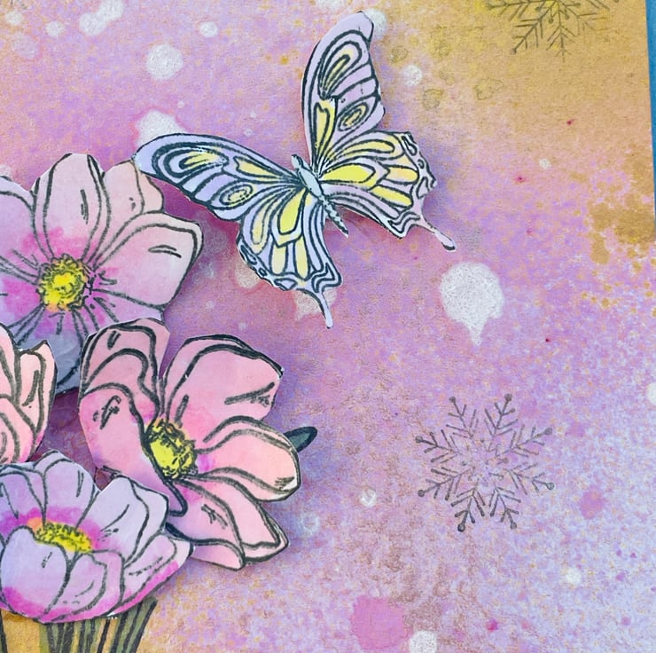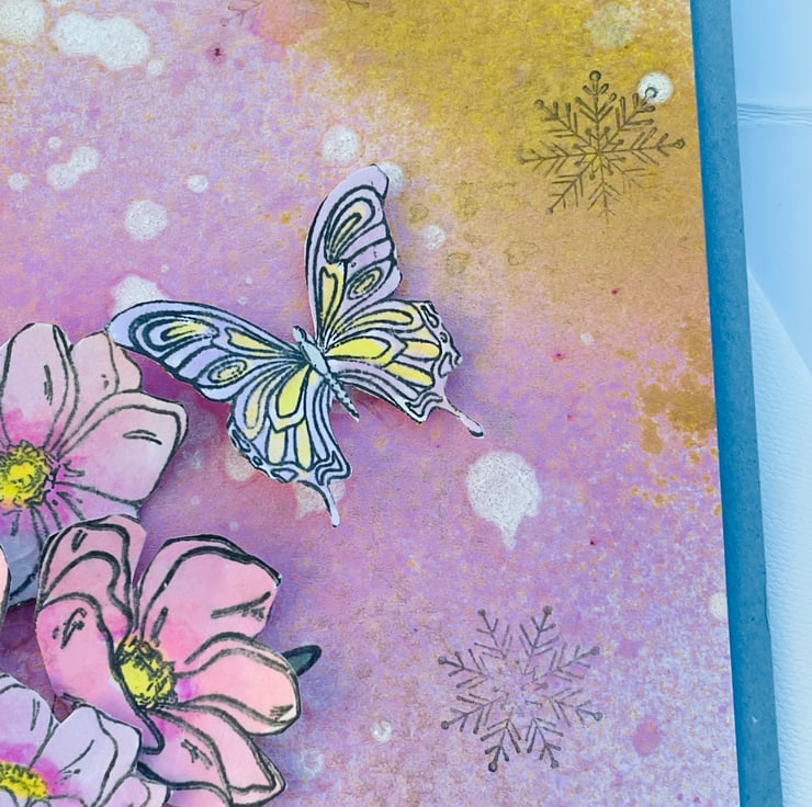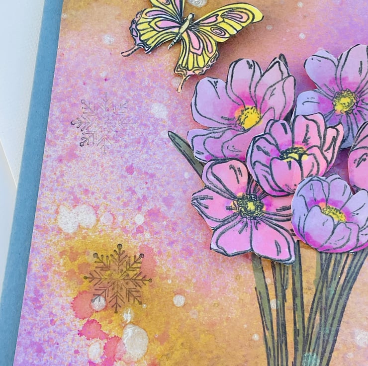 Simple and beautiful bunch of spring flowers to celebrate a special occasion. This 15x15cm card has a denim blue base. This is topped with a hand decorated paper. There is a random sprayed mix of pinks, gold and white. This makes a dreamy background with added snowflakes. A bunch of spring anemone are stamped, coloured and layered in soft pinks, yellows and green. 2 butterflies are hovering around the flowers. Spring time can bring flowers, snow and butterflies so something to look forward to.