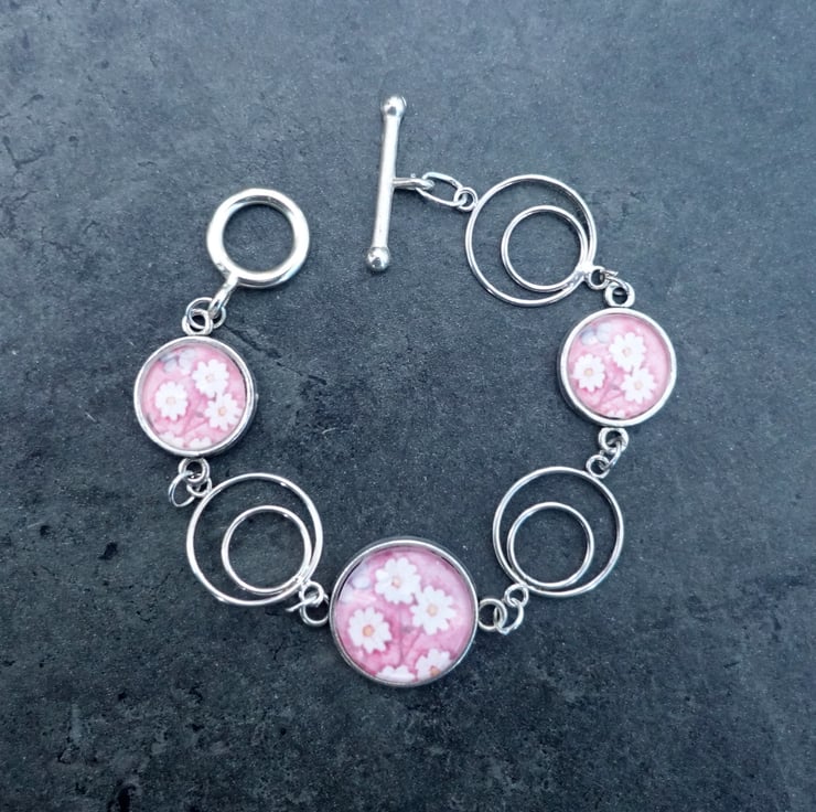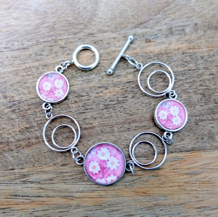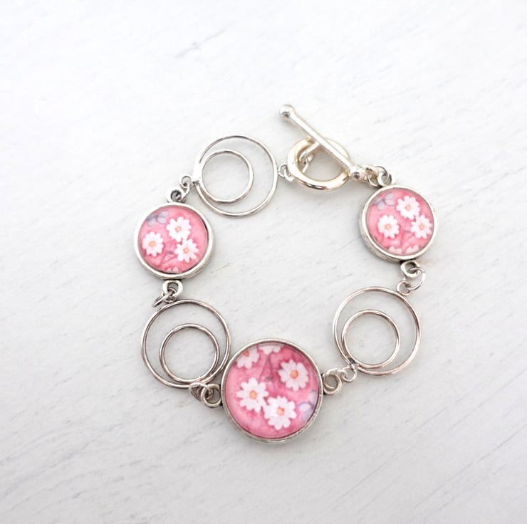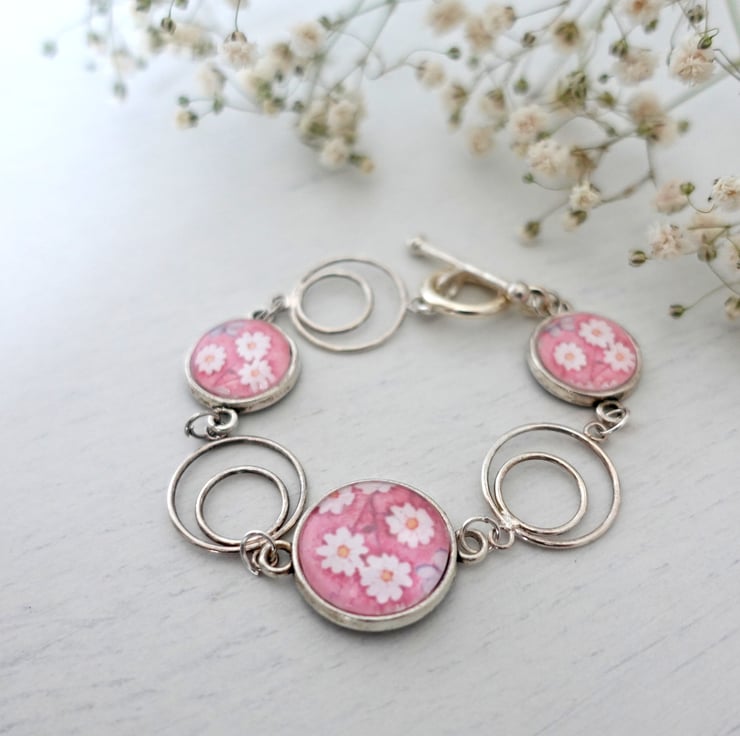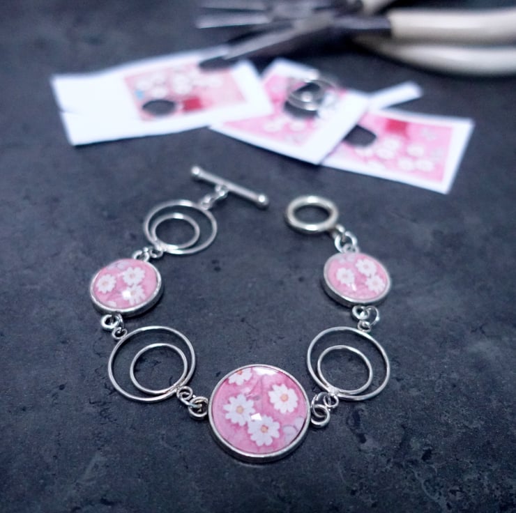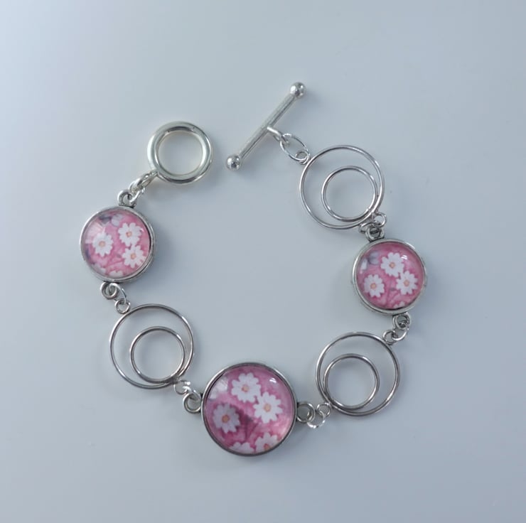 This dusty pink bracelet is very elegant and feminine, suitable as bridal jewellery for your handmade wedding. It features 3 pendant connectors with fine art prints from my original paintings, showing images with white daisy flowers against a dusty pink background and three circular metal connectors and a toggle clasp. The bracelet is 7.5" long.