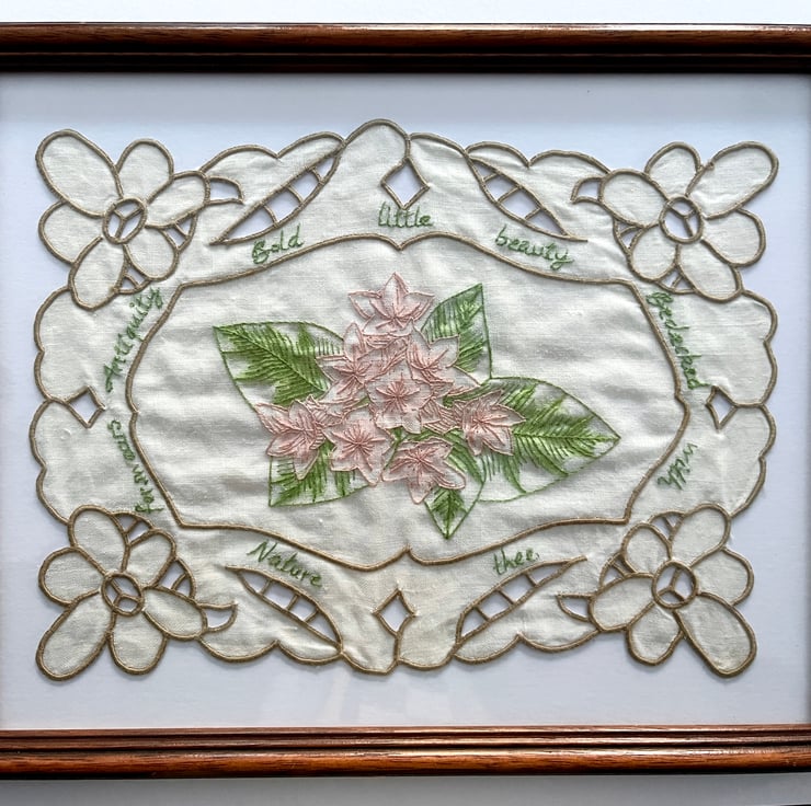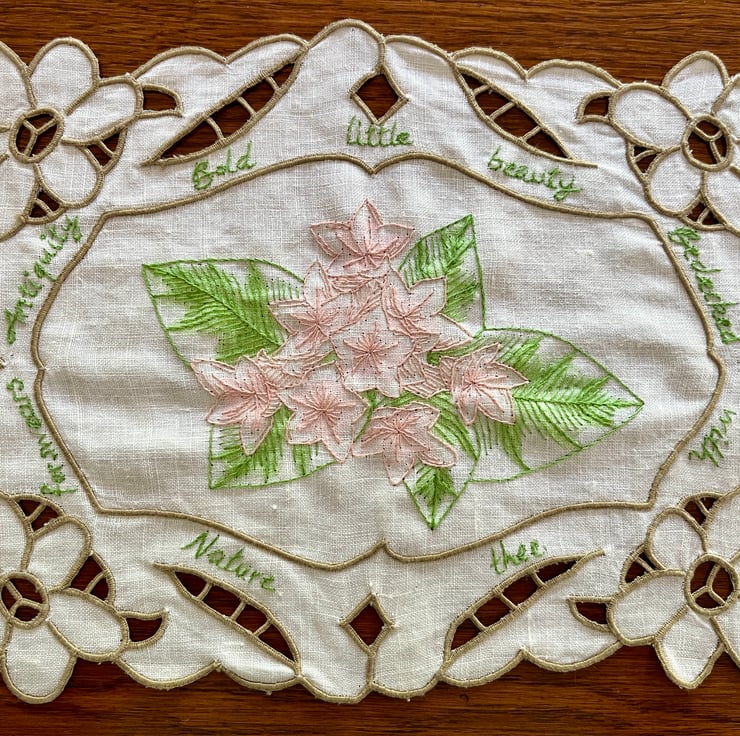 'Mayflower' is embroidered onto an antique cotton doily featuring lovely floral cutwork. This piece gives new life to heritage fabric, sustainably transforming a fragment of the past into a unique work of art for your home.