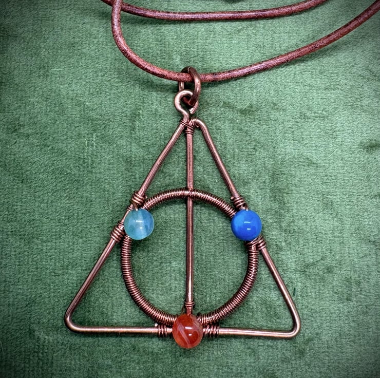 Antique copper wire wrapped Deathly Hallows pendant (Harry Potter inspired) with 6mm bead detail in Red Agate, Green Aventurine and Blue Agate. Comes with a 20"/50cm brown leather thong with antique copper wire fastenings, measures 5 x 5 x 5cm.