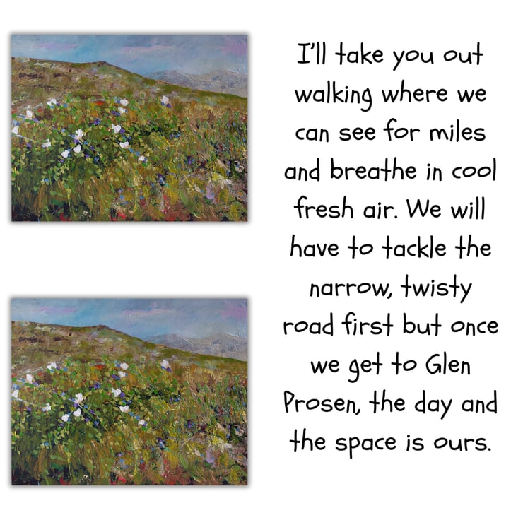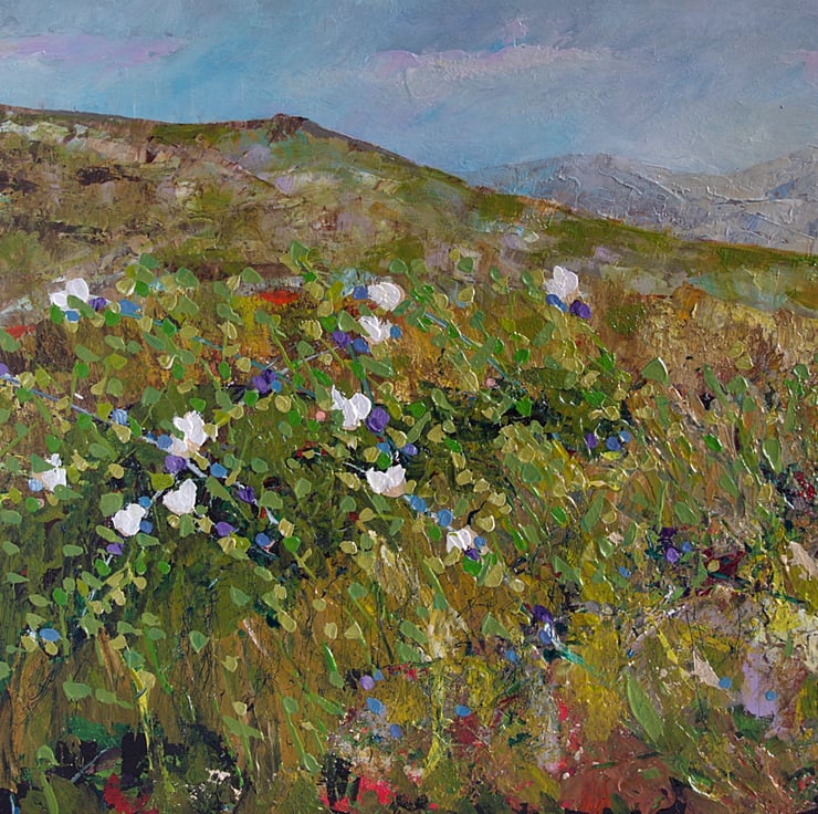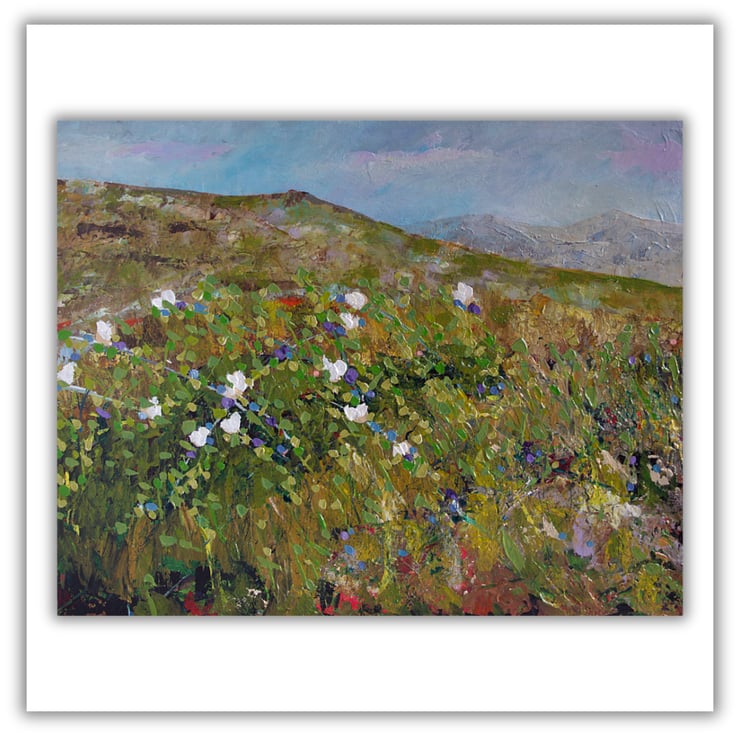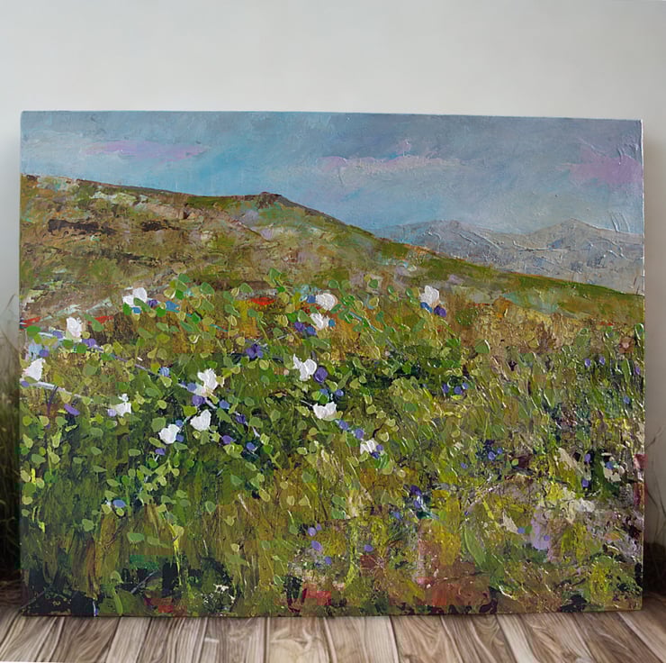 This is an original Scottish landscape featuring Glen Prosen in Angus. It has been completed in acrylic paints and is ready to hang. I have applied thick layers of paint and acrylic medium using a range of palette knives and brushes. The foreground is dominated by a mass of bright wildflowers leading the eye into the distance.
