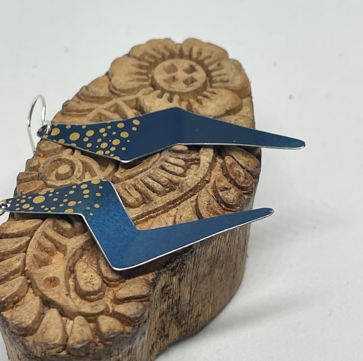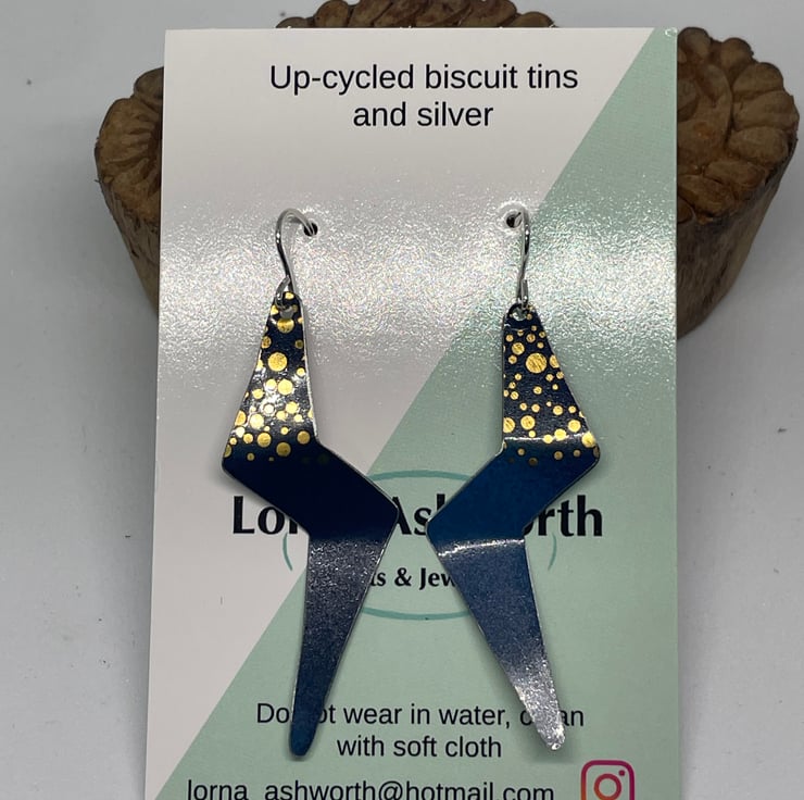 These lightning earrings are made from a recycled gift tin which I have hand cut, filed and shaped. They have also been lacquered to protect from scratches. These have a deep blue background that varies in shade and shiny gold spots in the top third.
