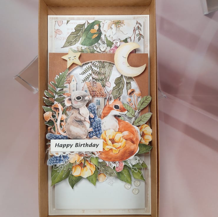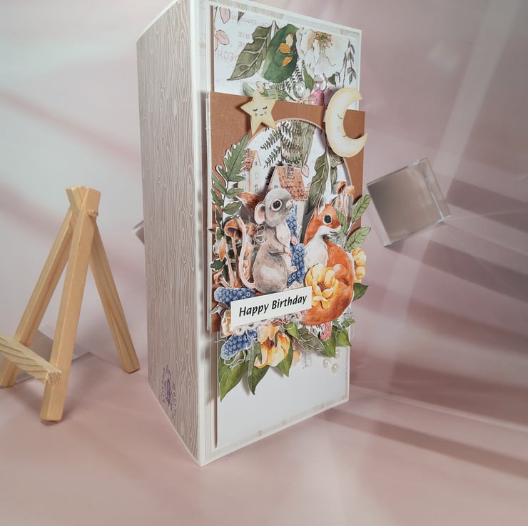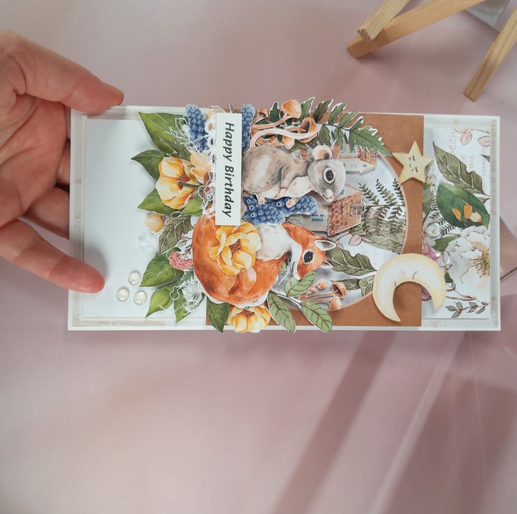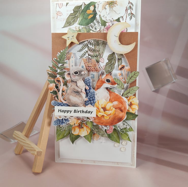 A charming handmade birthday card featuring a sweet woodland scene with forest animals, flowers and soft natural details. This delicate, storybook-style design makes a perfect birthday keepsake for both children and adults who love nature-inspired designs.