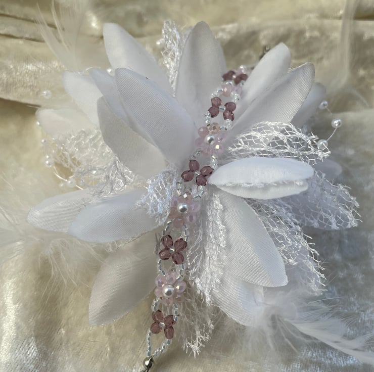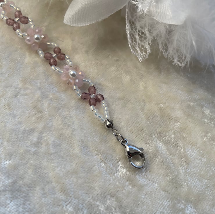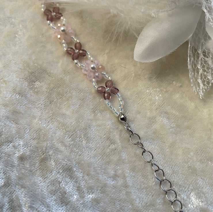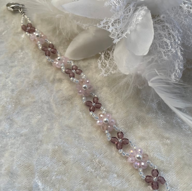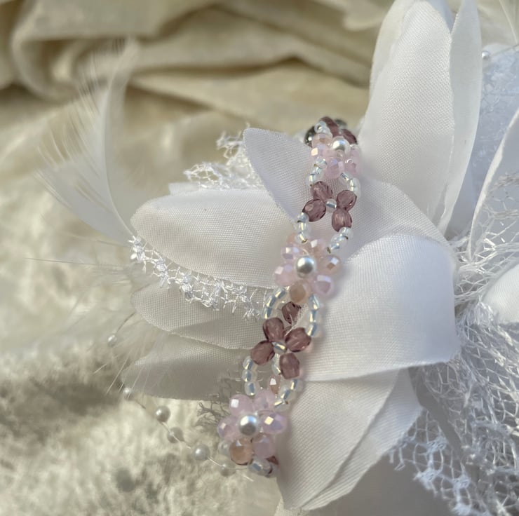 This pale pink flower bracelet is a handmade beaded featuring a beautiful flower design with glass beads. Perfect for weddings or any special occasion, this adjustable bracelet is a unique and stylish piece of jewellery. Approximately 8mm wide and 16cm long plus 2.5cm of extension.