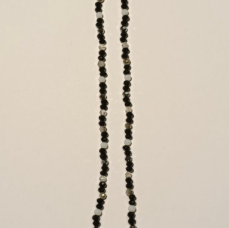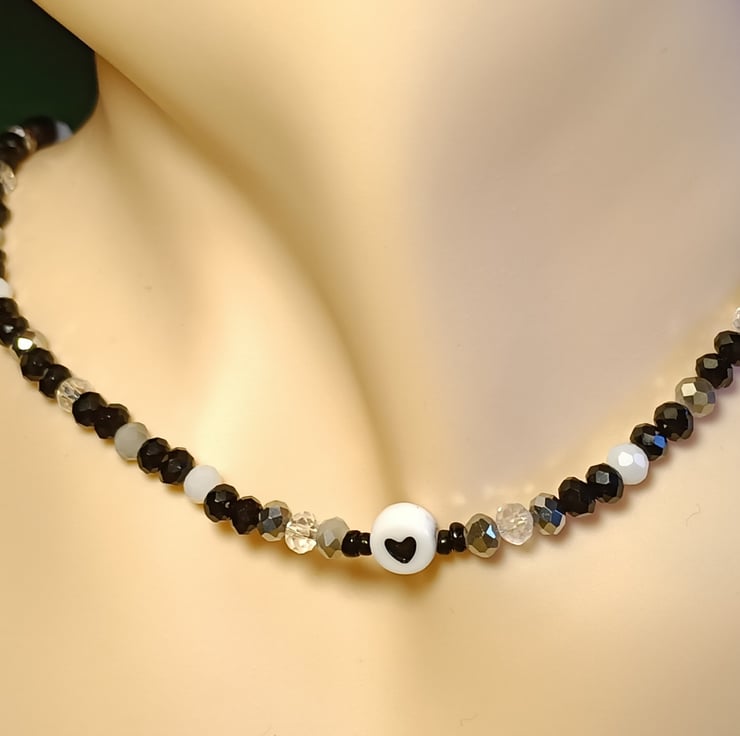 This unique piece consists of one 10mm round white bead with a black heart design as the centre piece. Next to the heart are 1mm black glass beads , 4mm two-toned silver and grey crystal beads, 4mm clear transparent beads , 4mm silver metallic crystal beads, 4mm black crystal beads and 4mm white crystal beads .
