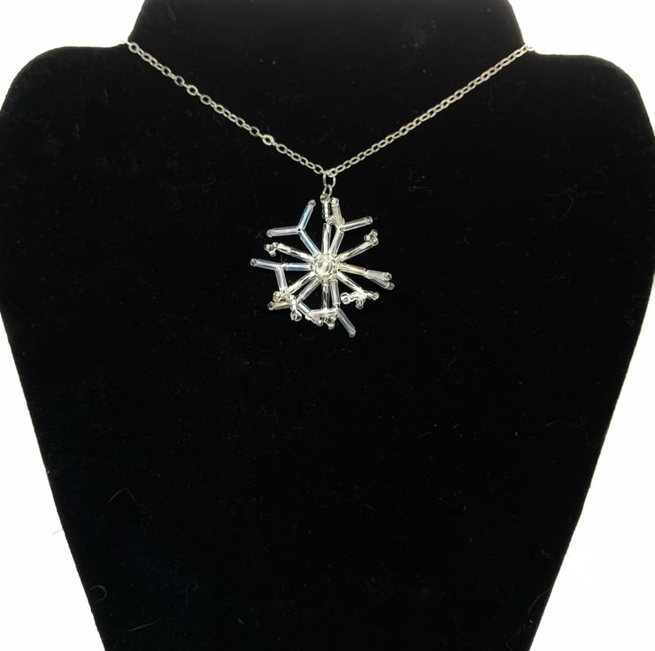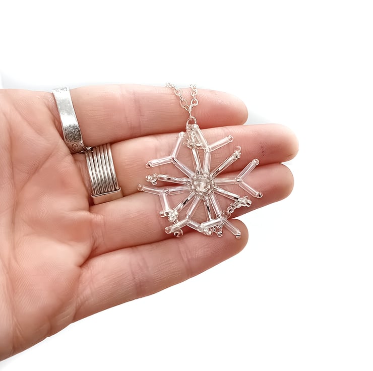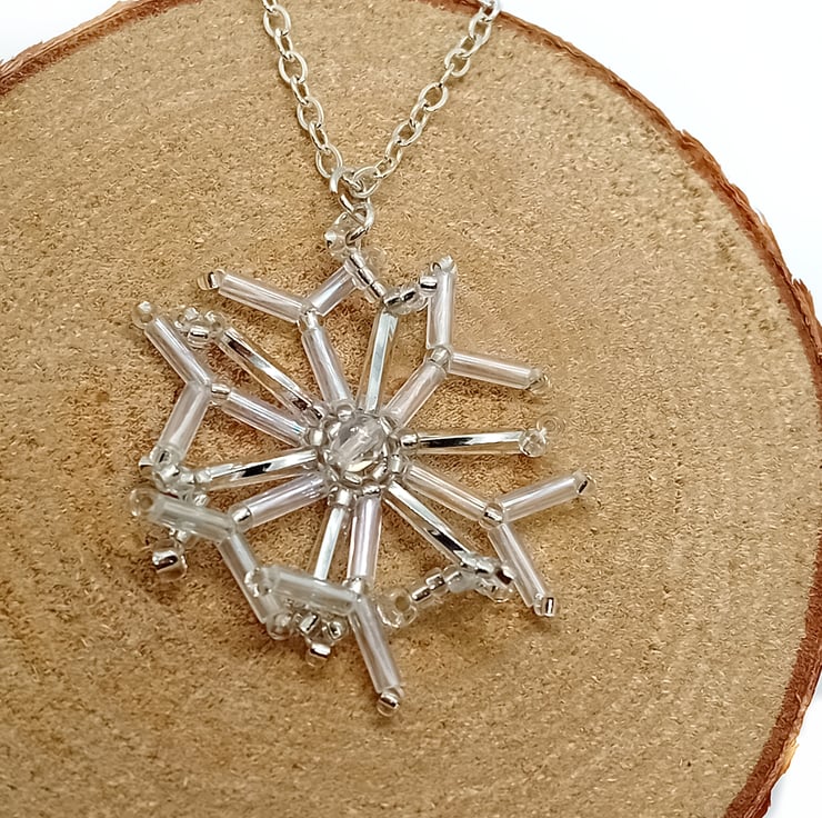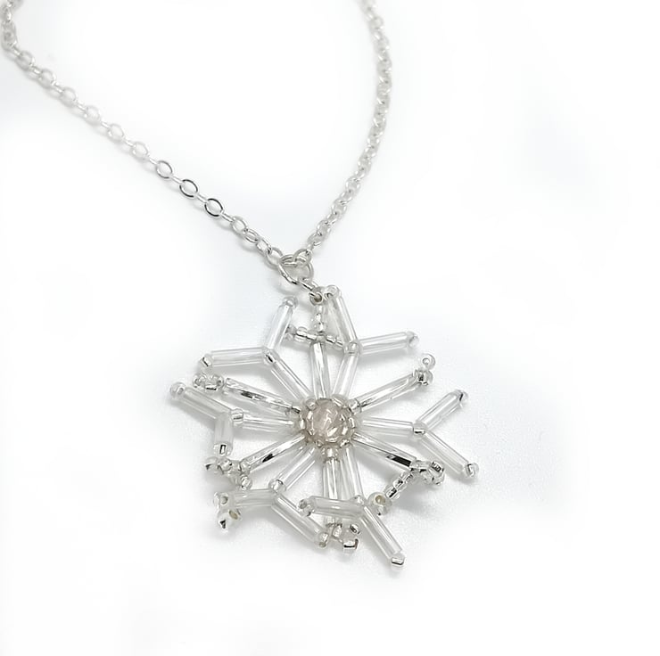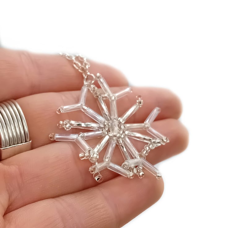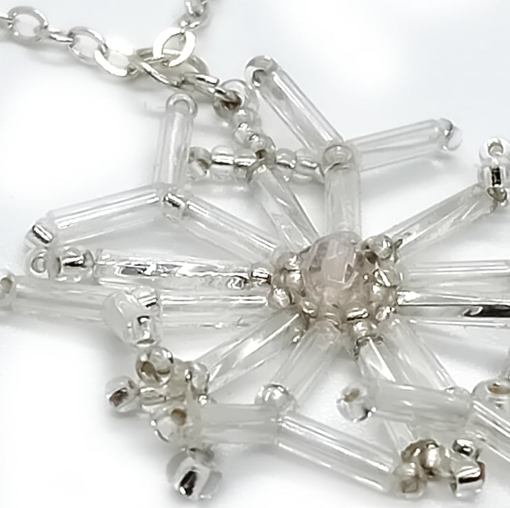 Silver and white beaded snowflake pendant necklace on trace silver chain